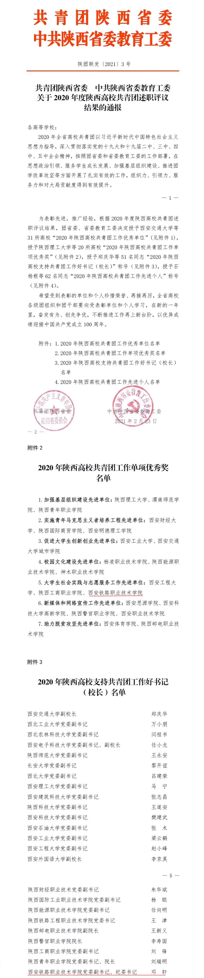 近日,共青团陕西省委与中共陕西省委教育工委联合发文对2020年度陕西高校共青团工作考核结果进行了通报与表彰(《共青团陕西省委 中共陕西省委教育工委 关于2020年度陕西高校共青团述职评议结果的通报》陕团联发【2021】3号)。鸭脖团委在2020年度陕西高校共青团工作考核中,被共青团陕西省委与中共陕西省委教育工委授予2020年陕西高校共青团工作“大学生社会实践与志愿服务工作先进单位”荣誉称号,全省高校被授予同称号的共有三所。同时,鸭脖党委副书记、纪委书记邓轩获得“2020年陕西高校支持共青团工作好书记”荣誉称号。