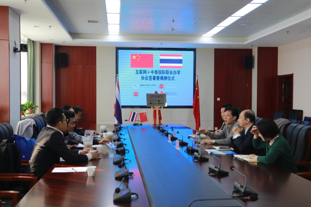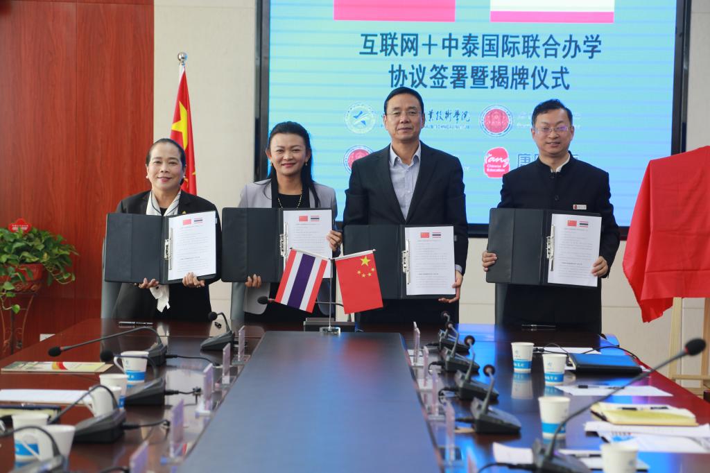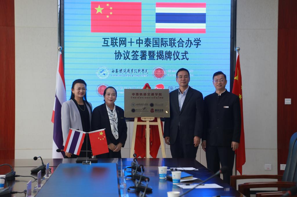 赵六杰代表学院与泰国曼谷职业教育中心、廊曼技术学院、唐风国际教育签订了“四方协议”,明确了各方在推进“互联网+中泰轨道交通学院”建设中的责任与义务。四方代表共同为“互联网+中泰轨道交通学院”揭牌。
