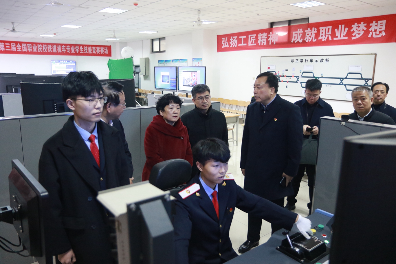 陈乃霞一行首先实地调研了学院党建文化长廊、思政文化长廊、师生风采榜和师生政治生活馆,听取了师生讲解团讲解的党建文化及思政文化相关内容,体验了“互联网+党建”学习平台,详细了解了党建特色工作及思政教育工作开展情况。随后参观了牵引动力学院城轨车辆模拟驾驶、磁悬浮列车等实训室,深入了解了学院专业实训基地的建设情况。党委书记施利民、院长赵春平从基层党建、“双高”建设、人才培养、招生就业等方面汇报了学院近年来的办学情况,表示学院今后将在不断强化党建引领、全面推进三全育人、提升人才培养质量等方面再下功夫,促进工作再上新的台阶。