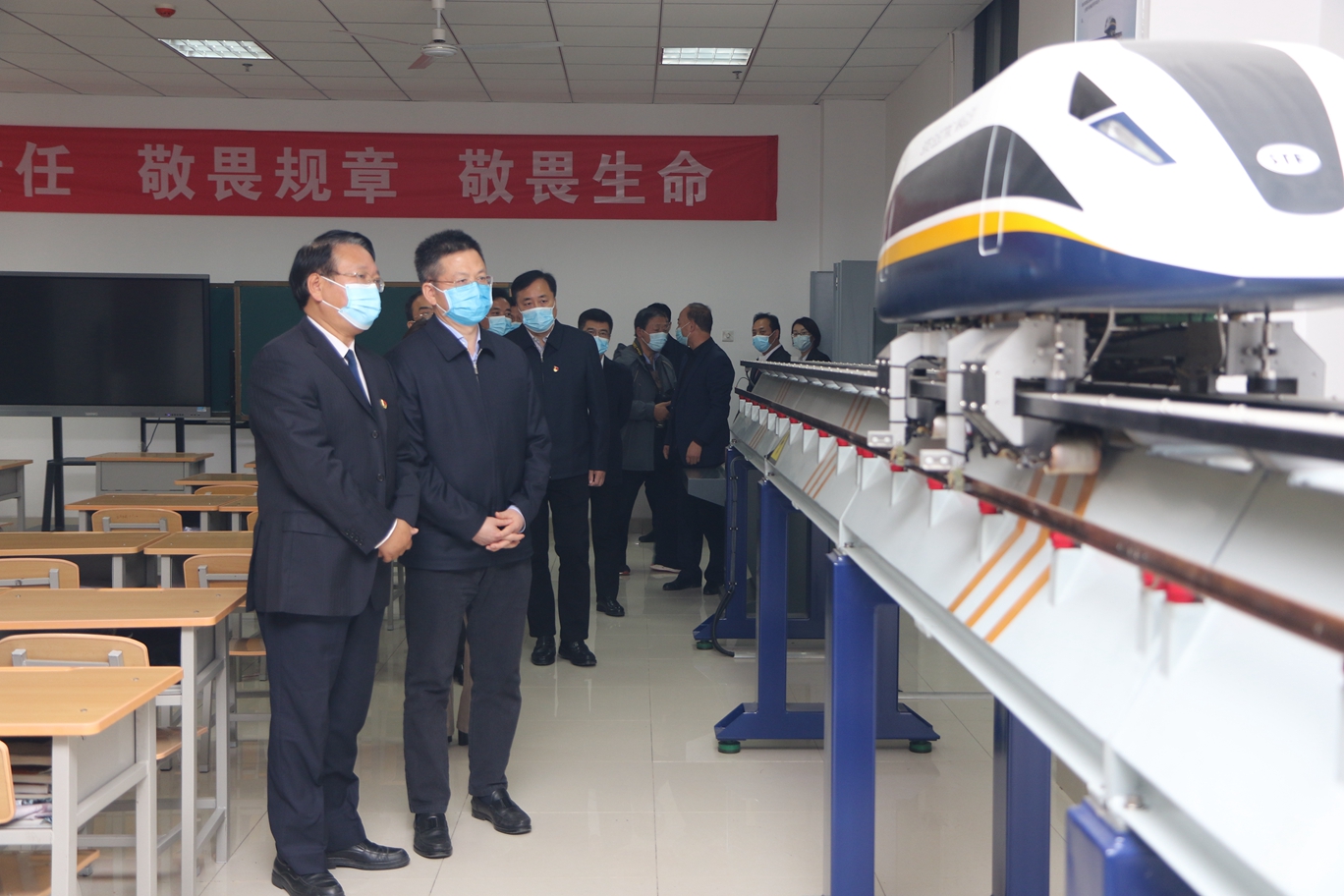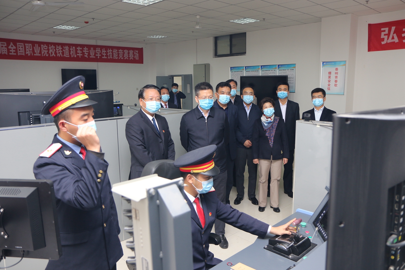 方光华一行首先实地调研了学院党建文化长廊和师生政治生活馆,听取了学生讲解的光辉历程、新的篇章、廉政清风、党性体检、筑强堡垒等党建文化版块内容,体验了“互联网+党建”学习平台。随后参观了牵引动力学院实训室和学院轨道交通综合实训场,深入了解了学院专业实训基地的建设情况。