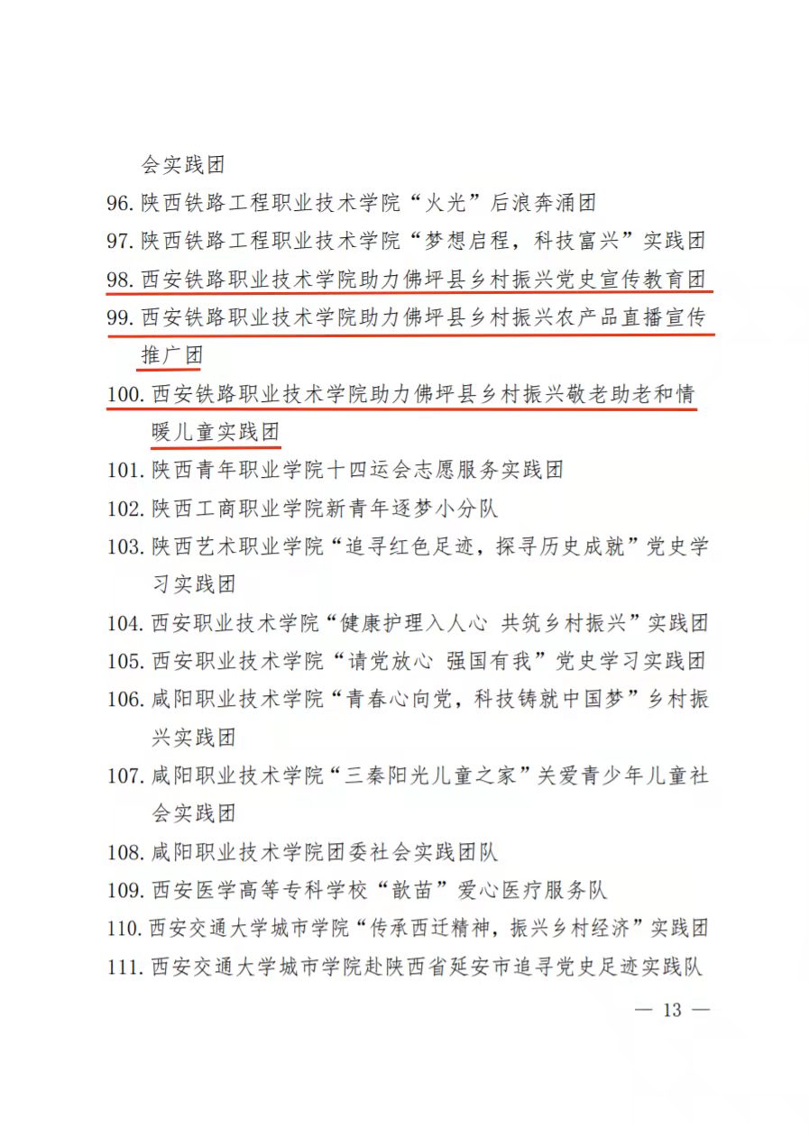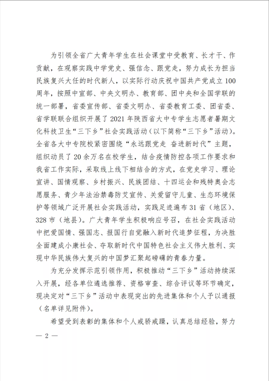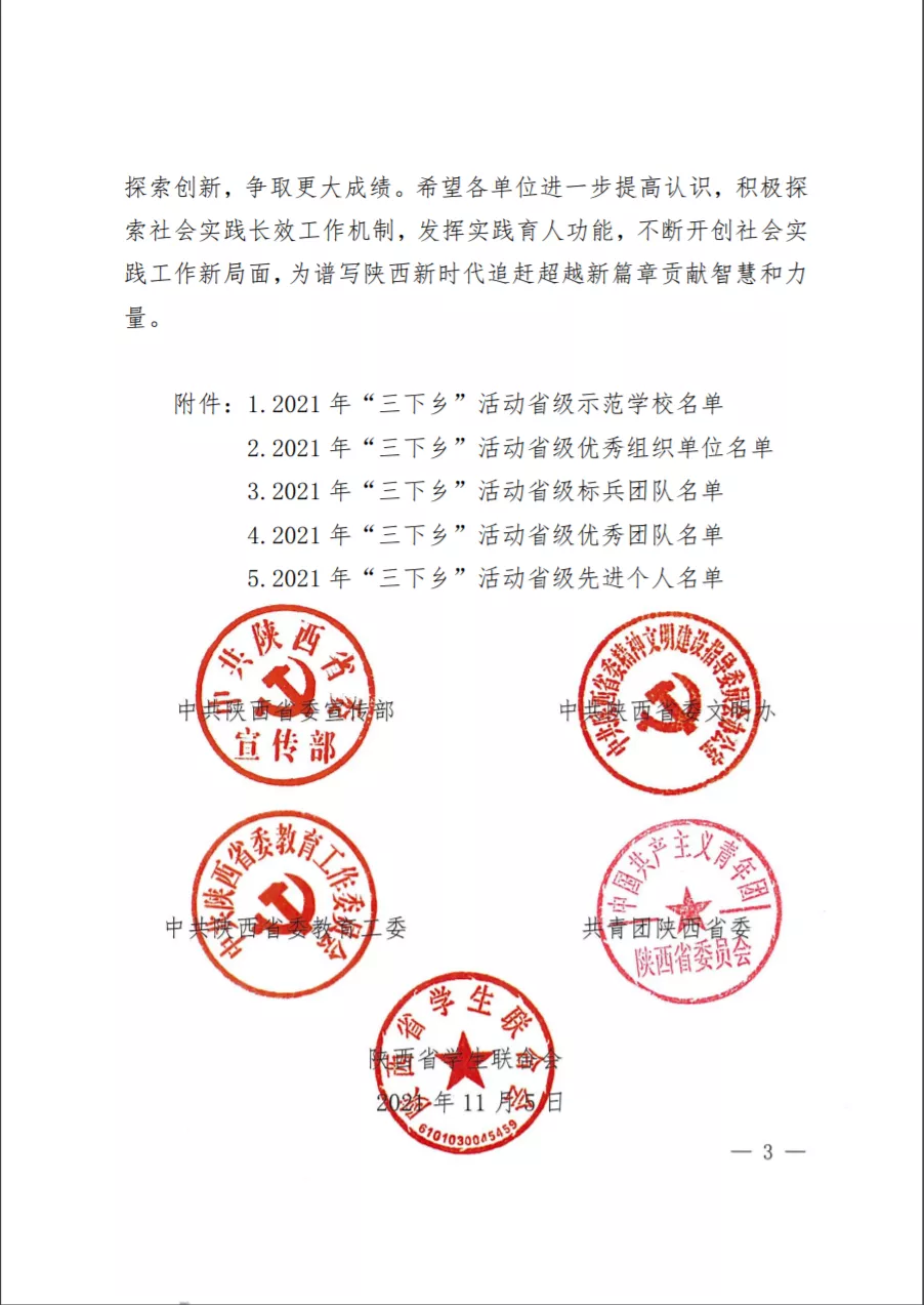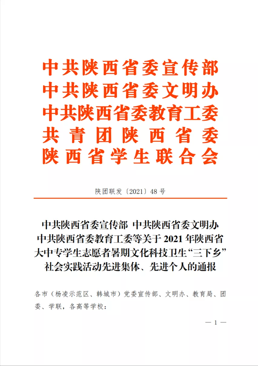 近日,陕西省委宣传部、陕西省委文明办、陕西省委教育工委、共青团陕西省委、陕西省学生联合会联合发文对2021年陕西省大中专学生志愿者暑期“三下乡”社会实践活动先进集体、先进个人进行了通报与表彰(《中共陕西省委宣传部 中共陕西省委文明办 中共陕西省委教育工委等关于2021年陕西省大中专学生志愿者暑期文化科技卫生“三下乡”社会实践活动先进集体、先进个人的通报》陕团联发[2021] 48号)。鸭脖荣获2021年“三下乡”活动“省级示范学校”称号,鸭脖助力佛坪县乡村振兴的党史宣传教育团、农产品直播宣传推广团、敬老助老情暖儿童实践团获“省级优秀团队”称号,院团委李妮、田辰两位同志获“省级先进个人”称号。