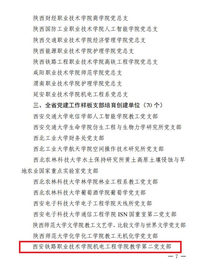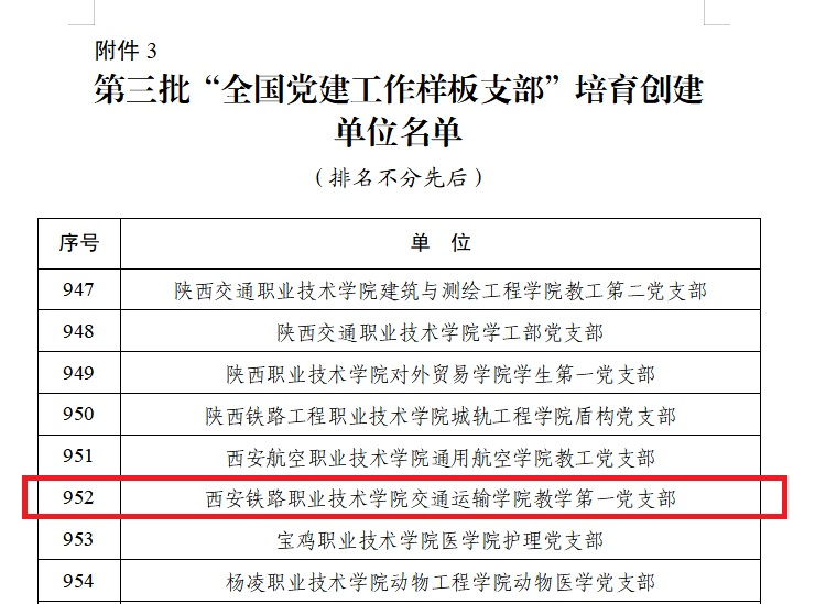近日,陕西省委教育工委公布了全省第三批新时代高校党建示范创建和质量创优工作遴选结果,鸭脖成功入选第三批“全省党建工作示范高校”培育创建单位,交通运输学院党总支教学第一党支部入选全国党建工作样板支部培育创建单位,机电工程学院党总支教学第二党支部入选全省党建工作样板支部培育创建单位。