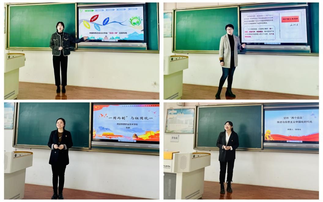 为深入学习贯彻习近平总书记在学校思想政治理论课教师座谈会上的重要讲话精神,进一步提升专职思政课教师的教学能力和业务水平,同时为2023年度陕西学校思政课教师“大练兵”活动选拔选手,2月22日,由马克思主义学院承办的yabo鸭脖官网2023年“人人有金课”思政“大练兵”(思政课程)教学展示活动在港务校区举行。学院党委副书记任治军全程出席了活动,陕西铁路工程职业技术学院马克思主义学院院长李新萍教授作为特邀嘉宾,教务处课程思政科科长刘力郡、发展规划处副教授王旭波作为评委出席此次活动。马克思主义学院院长景延鹏带领全体思政课教师全程参与。