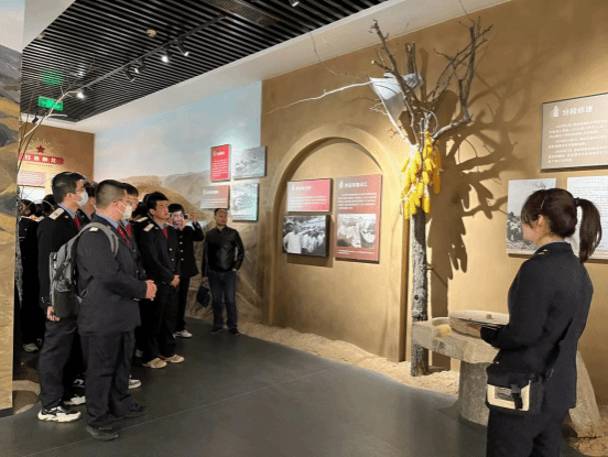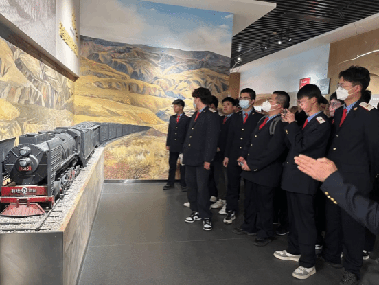在工作人员的带领下,学生参观了陕北铁路展馆,该展馆以陕北革命老区人民对铁路的情感变迁为主线,采用独特的文化视角生动呈现了老区人民从刚开始的殷切期盼、到建成开通的欢欣鼓舞,再到新时代的慷慨激昂等一系列的情感变化路程。展馆采用了当地流传的铁路民谣进行编织,划分成“筑路·中央和咱心连心”“圆梦·火车开到宝塔山”“发展·坐上火车逛北京”“腾飞·巨龙驰骋谱新篇”四大版块,以全方位展现了陕北铁路从规划、建设到发展壮大的历史进程,生动反映陕北铁路取得的突出成就以及对陕北革命老区经济社会发展的推动作用。