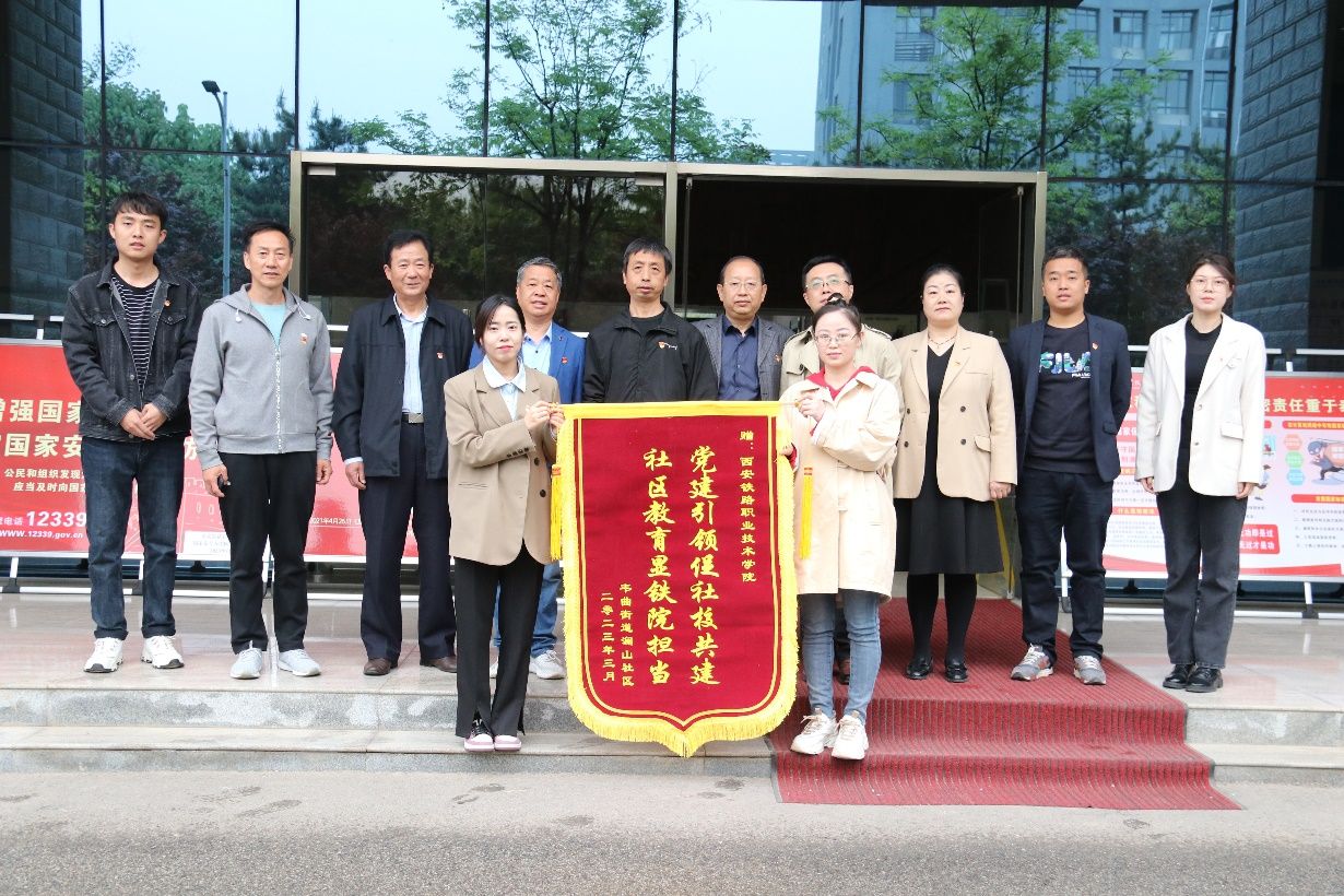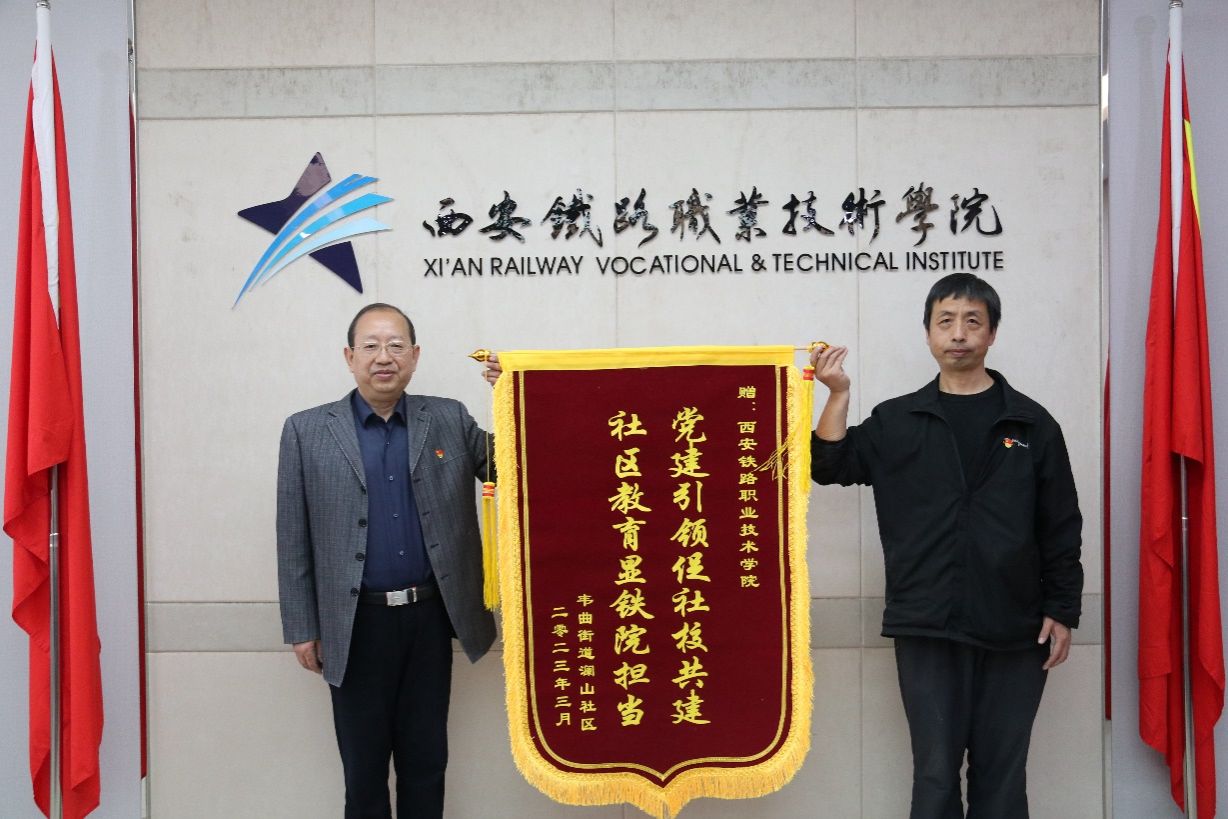 交流座谈结束后,武勇代表长安区韦曲街道澜山社区向yabo鸭脖官网送锦旗,任治军代表学院接受锦旗。