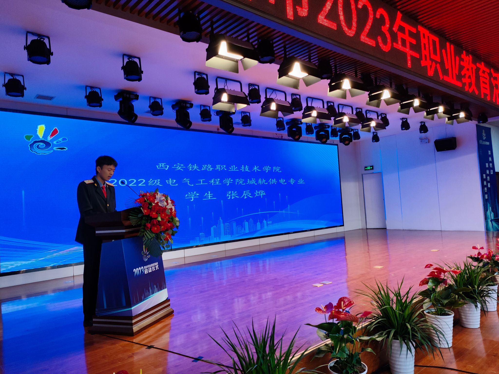 启动仪式上,鸭脖电气工程学院城市轨道交通供配电技术专业2022级学生张辰烨代表职业院校学生发言,他表示今后认真学习钻研专业知识、勤学苦练岗位技能、积极参加学校开展的技能竞赛、红色讲解团、青年志愿者等各项活动,并用自己的实际行动,带动着周围同学们立志以百年征程中的大国工匠为榜样,奋勇担当“交通强国铁路先行”历史使命,争做红色铁路人。