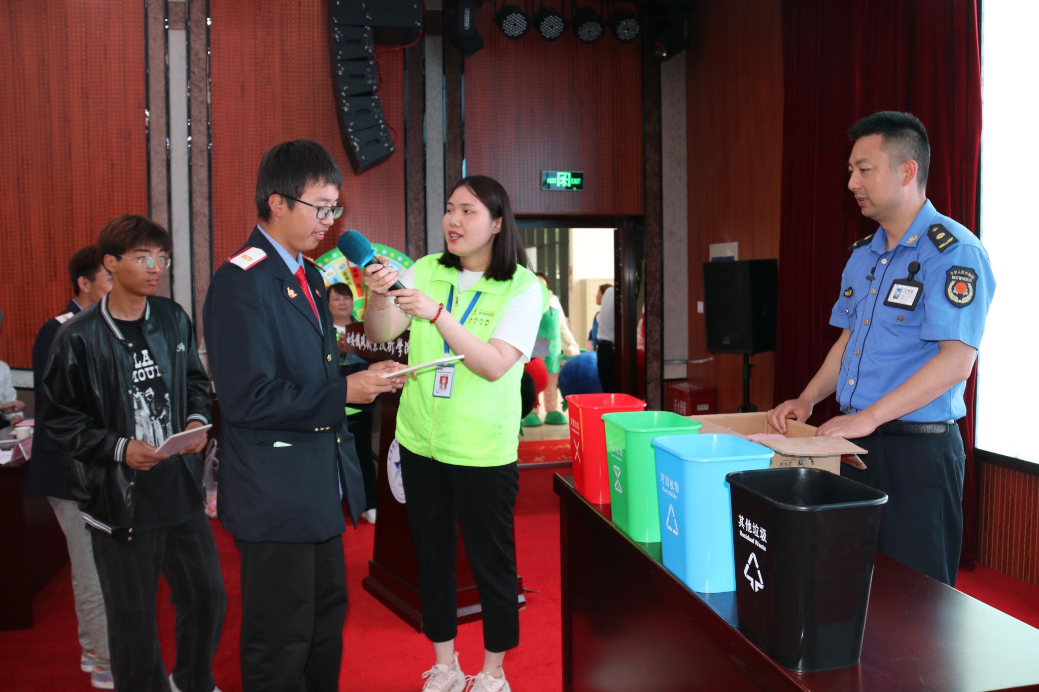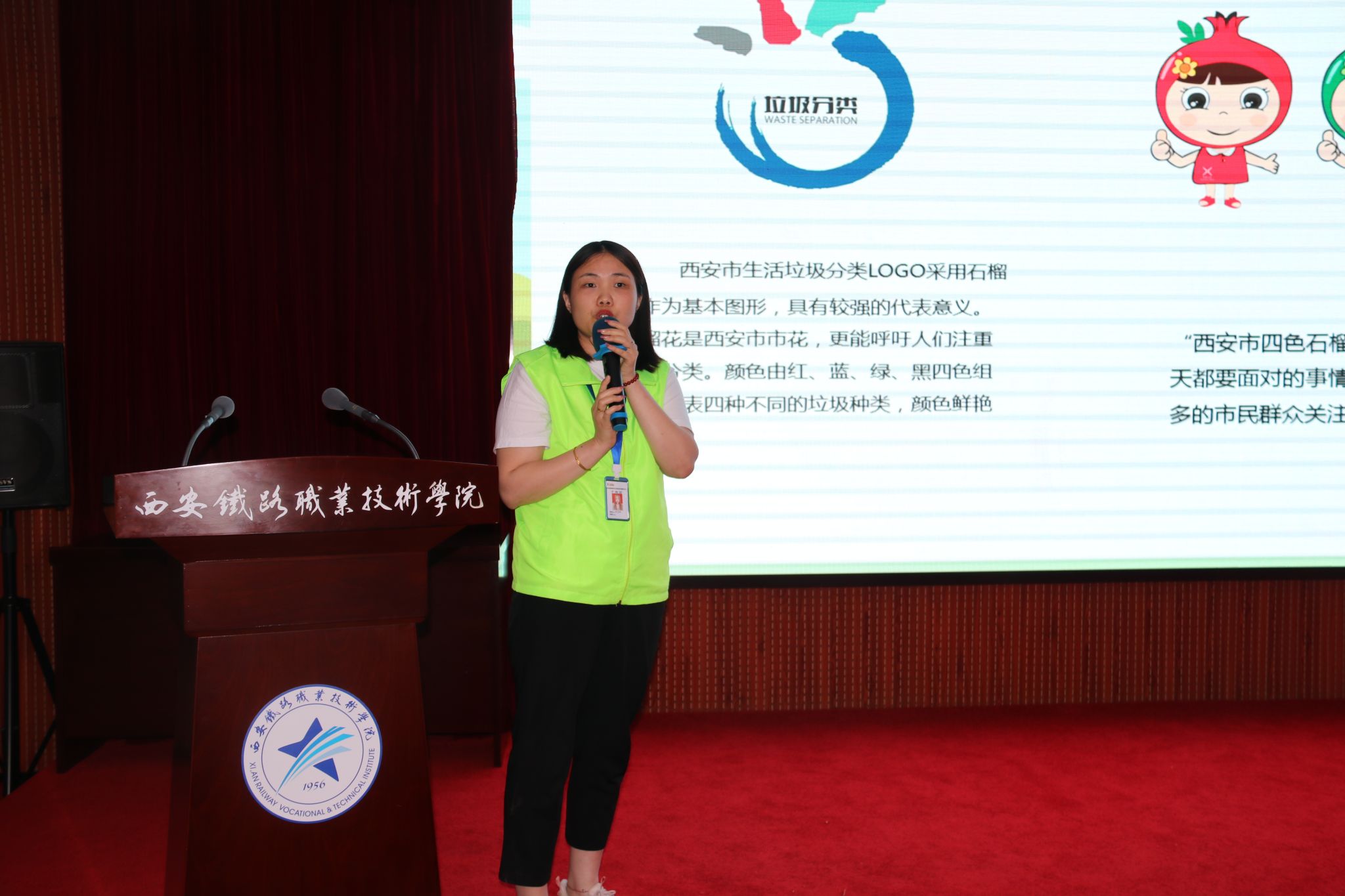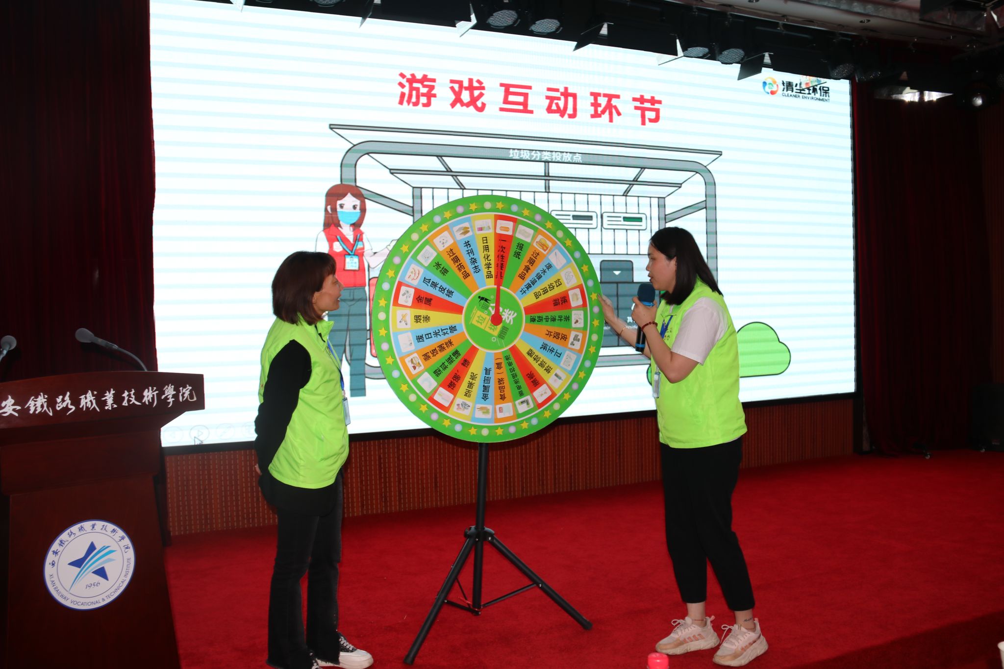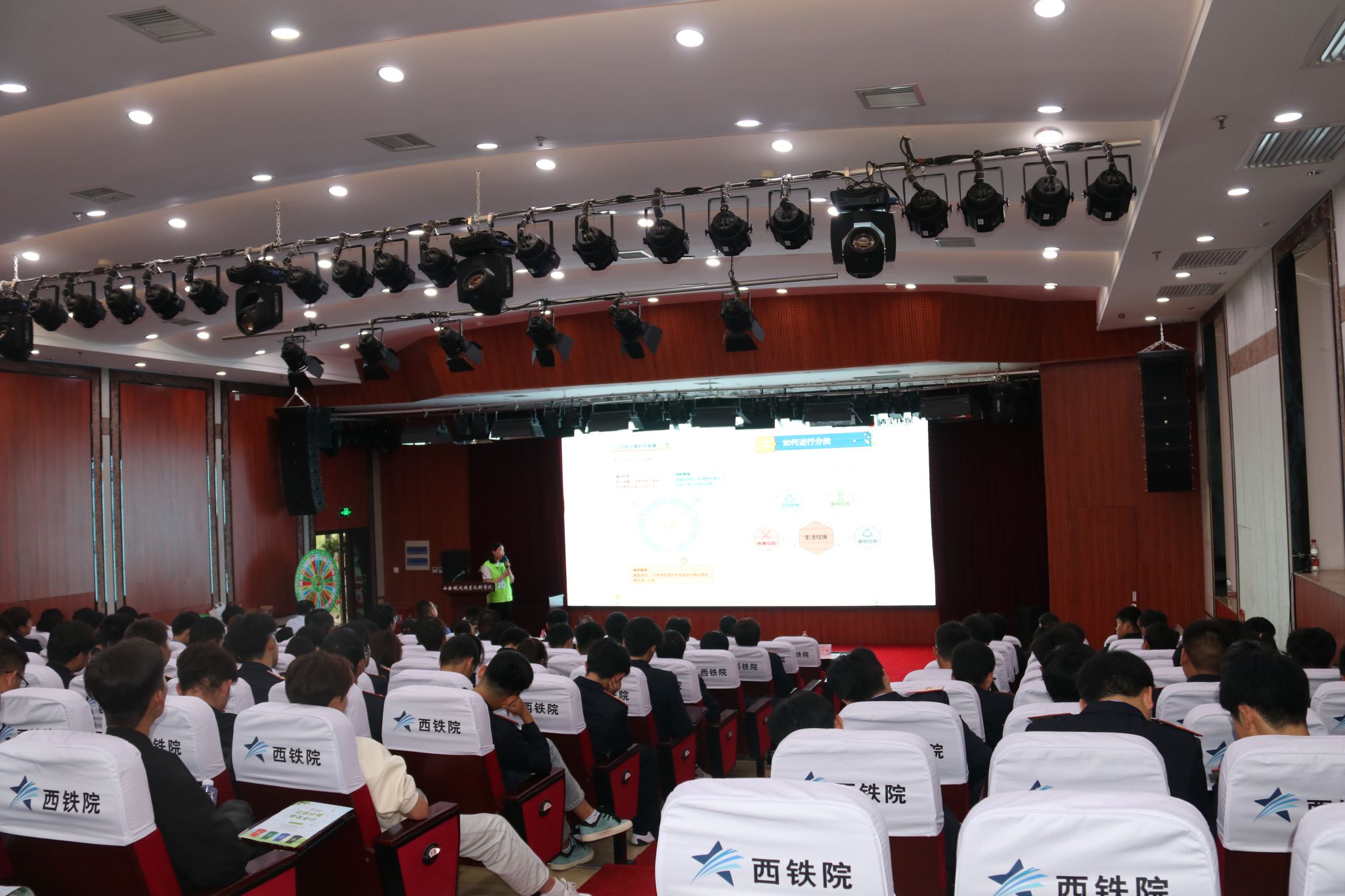 在报告厅门口两侧,整整齐齐摆放着垃圾分类知识展板10余块,营造出浓厚的宣传氛围,师生在活动开始前纷纷驻足观看学习。活动开始后,港务区执法局生活垃圾分类办负责人马奎、宣传干事佘鹏乐、垃圾分类讲师张雪秋进行垃圾分类知识宣讲,并进行现场竞答和投放演示。张雪秋老师从垃圾分类重要意义、如何进行分类、分类后收运和处理、相关法律责任四个方面进行了宣讲,介绍了西安生活垃圾分类LOGO(石榴花)、西安每日垃圾量和人均日产生1公斤垃圾,给大家留下了深刻印象。马奎、佘鹏乐现场表演快板书《生活垃圾分类引领新风尚》,以生动的艺术形式宣传垃圾分类知识,赢得大家阵阵热烈的掌声。在现场互动环节,张雪秋老师通过转盘游戏进行分类知识竞答、解疑,并组织学生和教职工进行垃圾模拟投放,现场气氛热情高涨,参与者都领到了可爱的小奖品。