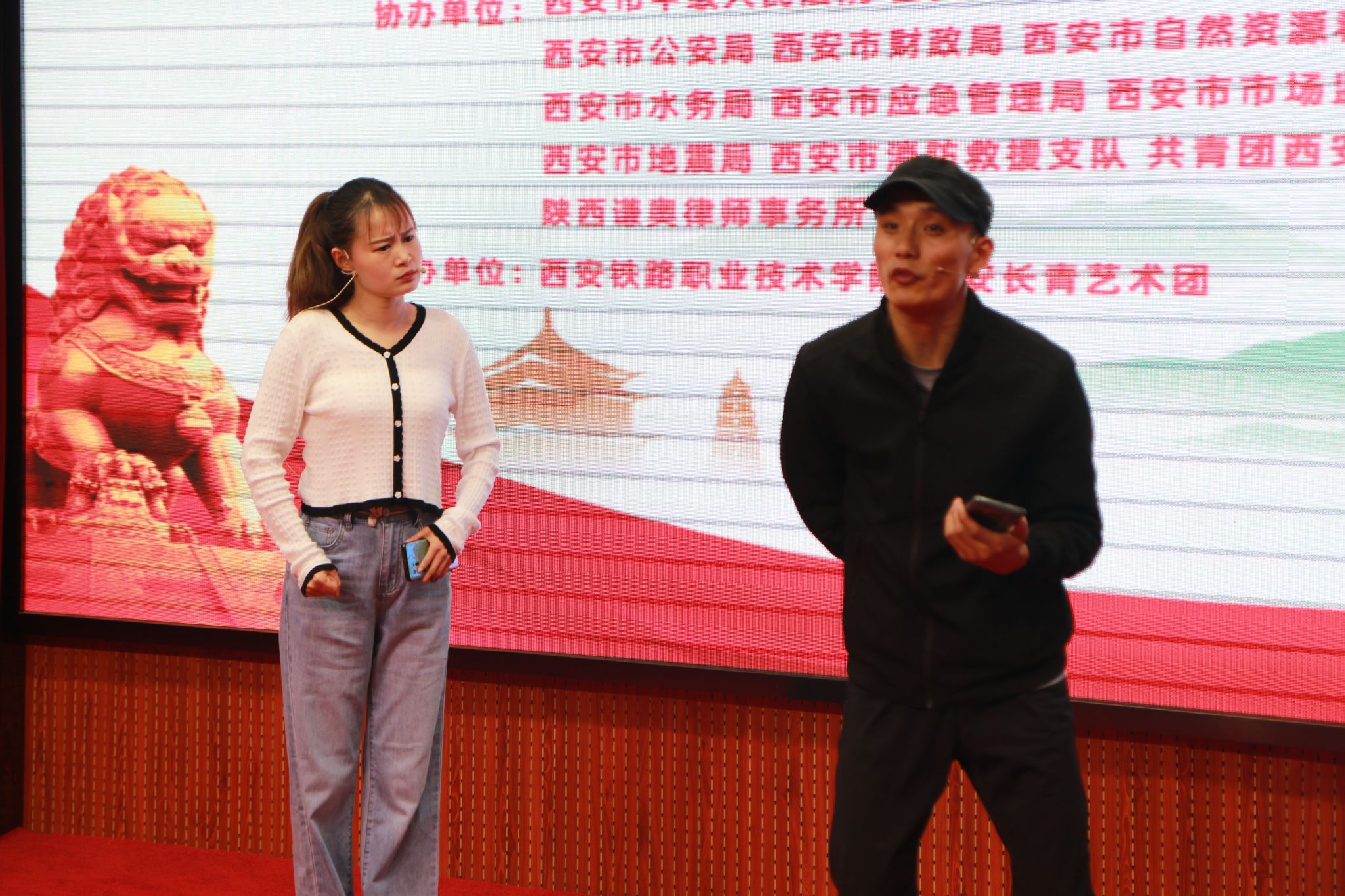 鸭脖与西安市律师协会、市长青艺术团联合举办法治文艺节目,节目紧扣“美好生活·民法典相伴”法治宣传主题,融合快板、歌舞、独唱、情景剧、小品等文艺表演形式。演出在舞蹈《擎旗》中拉开帷幕,伴着响亮的快板节奏,普法音乐剧《道路普法劝导站》,循循善诱,告诫大家时刻牢记交通法规,文明出行;《祖国大地处处春》在法治中国的旋律中,讴歌美好家园;音乐小品《防诈骗》,引导同学们高度警惕各类新型诈骗犯罪,摈弃不劳而获,用奋斗创造未来。歌曲《我们都是追梦人》,唱出了新时代司法行政干警的心声,逐梦新征程,奋进向未来;情景剧《时光列车》,将观众带入民法典诞生的“时空隧道”,展望“强国有我”的青春梦想;舞蹈《孩子的天空》,为学法者而歌,为守法者而舞。整场演出气氛热烈,震撼人心,引导师生从我做起,学用结合,争做尊法学法守法用法的践行者。