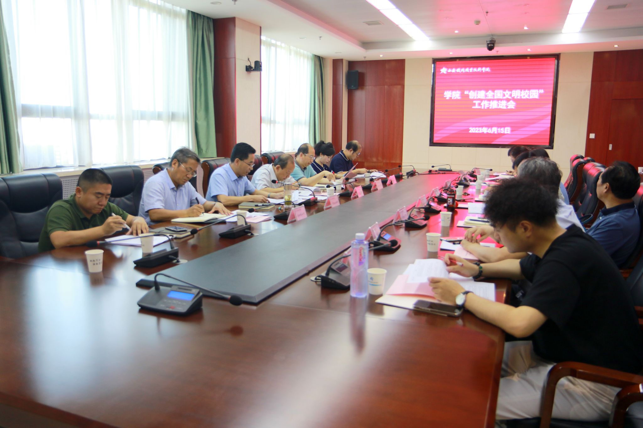 6月15日,学院召开创建全国文明校园工作推进会。党委副书记任治军、创文办成员单位负责人、各二级学院党总支书记,以及各部门负责“创文”工作的科级干部和信息员参加了会议,会议由党委宣传部部长王琛主持。
