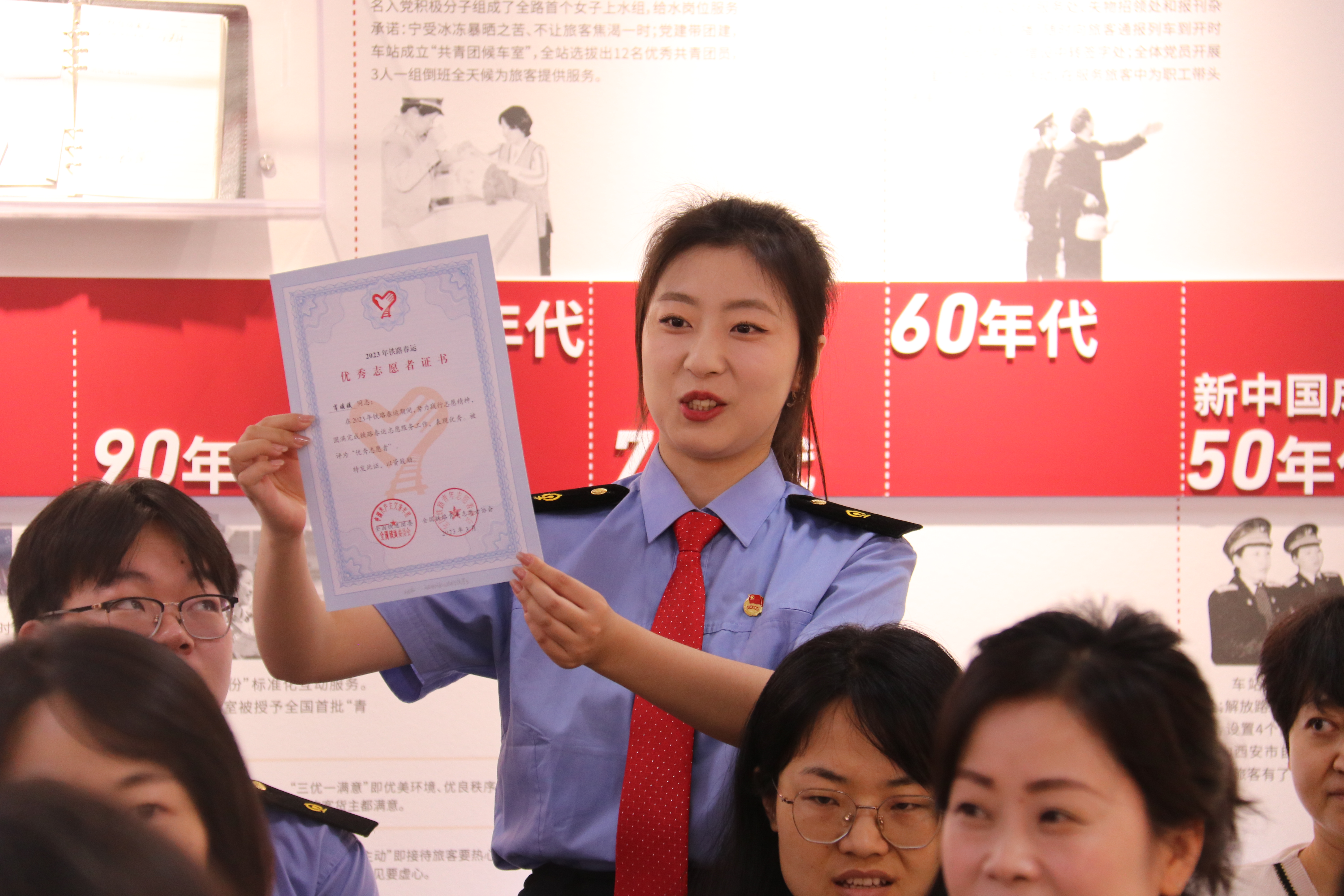 活动伊始,西安站党委书记舒辉、副书记毛显颖对鸭脖师生的到来表示热烈欢迎,在引导员的带领下,鸭脖师生参观了改造一新的西安站东广场、南门厅,感受了中厅创新与古朴交融的文化底蕴;观摩了“蒸汽主题”、“内燃主题”、“电气主题”和“高铁主题”四个火车博物馆和“会说话的铁路老物件”,在匆匆而过的人流中感受了时代的变迁、铁路的发展;学习了全国铁路党内优质服务品牌——“丝路缘”创建情况,深刻体会到西安站的优质服务源自亲情传承,匠心服务源自专注创新;师生们在铁路文化长廊了解了西安站自1934年建站以来近百年的发展历程和沧桑巨变,深切感悟到铁路人在交通强国路上矢志不渝的爱国情怀和践行“人民铁路为人民”服务宗旨的赤子之心。