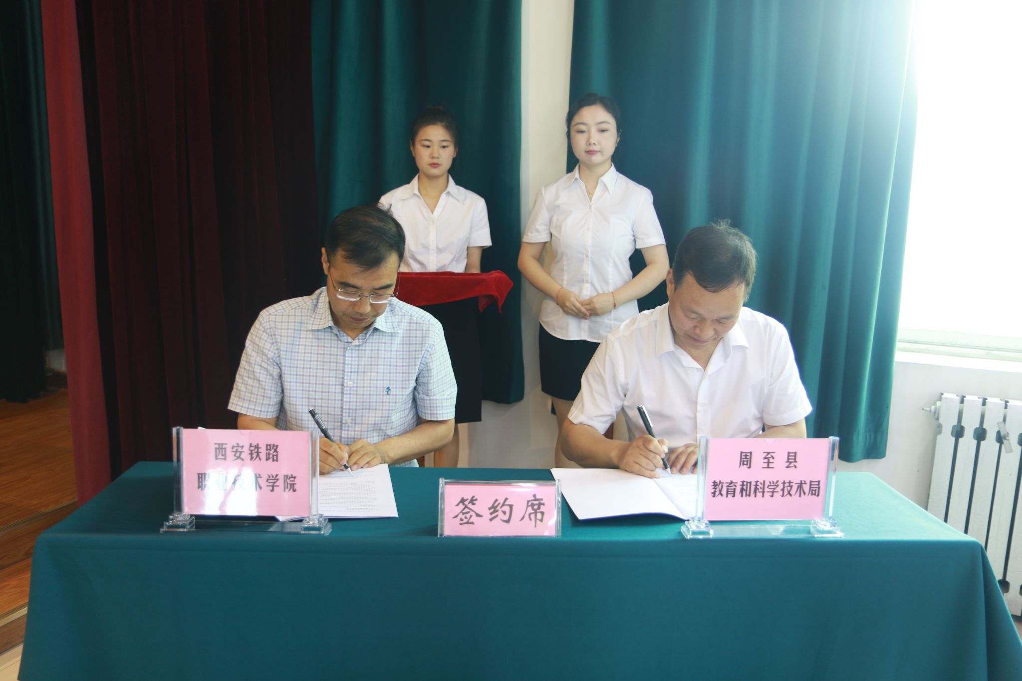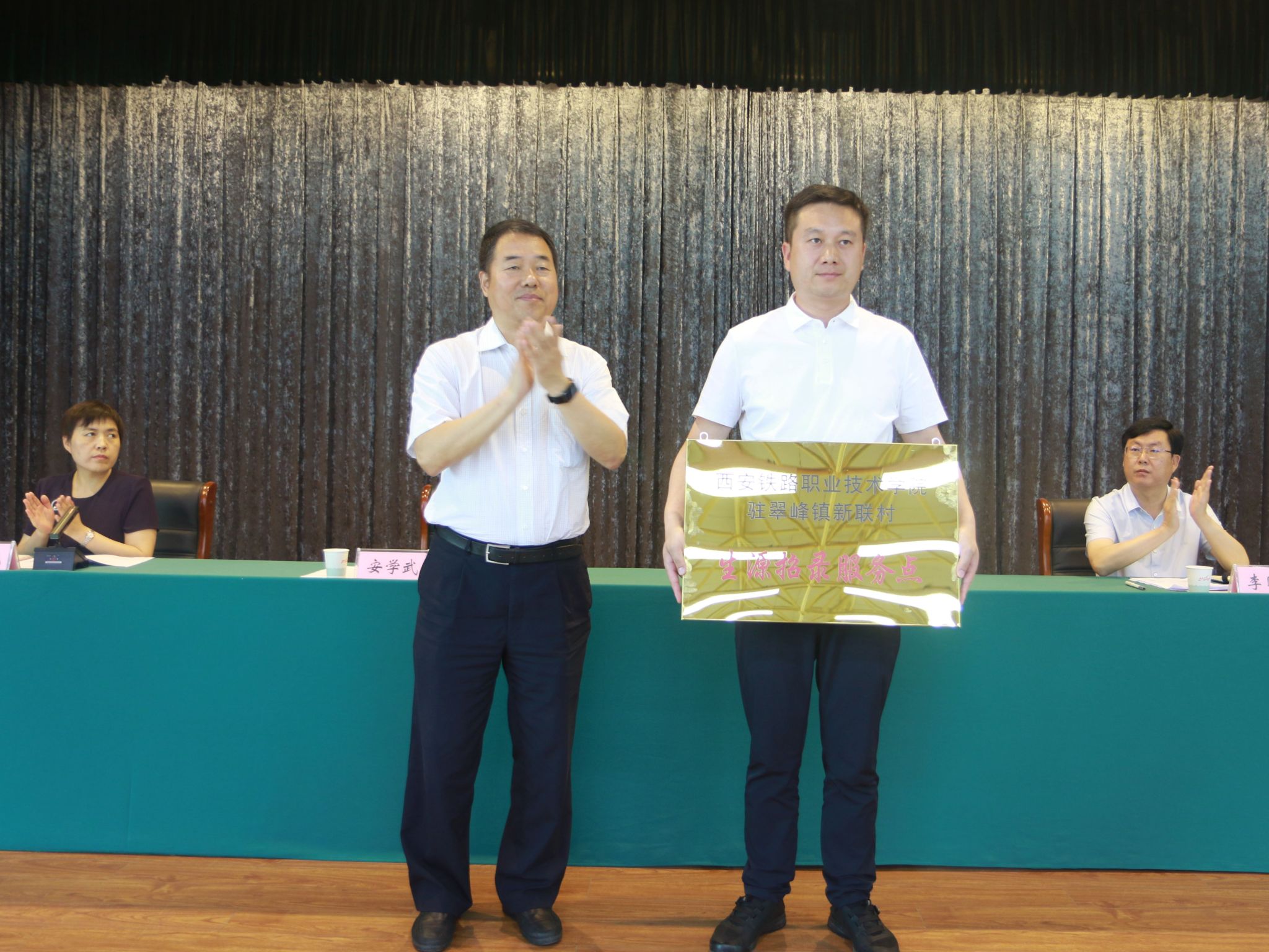 教务处处长腾勇代表学院与周至县教育科技局党委书记、局长任孝根签订《职业教育合作办学协议》,并为学院驻周至县翠峰镇新联村生源招录服务点授牌。