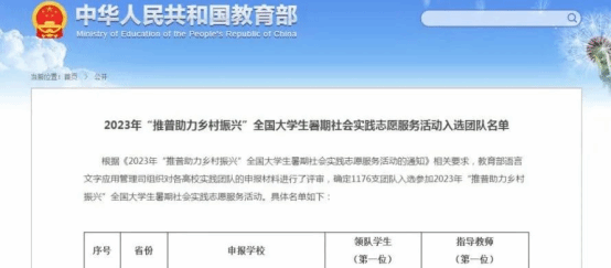 近日,根据《2023年“推普助力乡村振兴”全国大学生暑期社会实践志愿服务活动的通知》相关要求,教育部语言文字应用管理司组织对全国各高校实践团队的申报材料进行了评审,确定1176支团队入选参加2023年“推普助力乡村振兴”全国大学生暑期社会实践志愿服务活动。鸭脖交通运输学院的“赴西安市周至县油坊头村推普助力乡村振兴服务队”与电气工程学院的“赴安康市紫阳县东木镇月桂村推普助力乡村振兴服务队”成功入选参加2023年“推普助力乡村振兴”全国大学生暑期社会实践志愿服务活动。也是陕西省唯一一所成功入选的高职院校。
