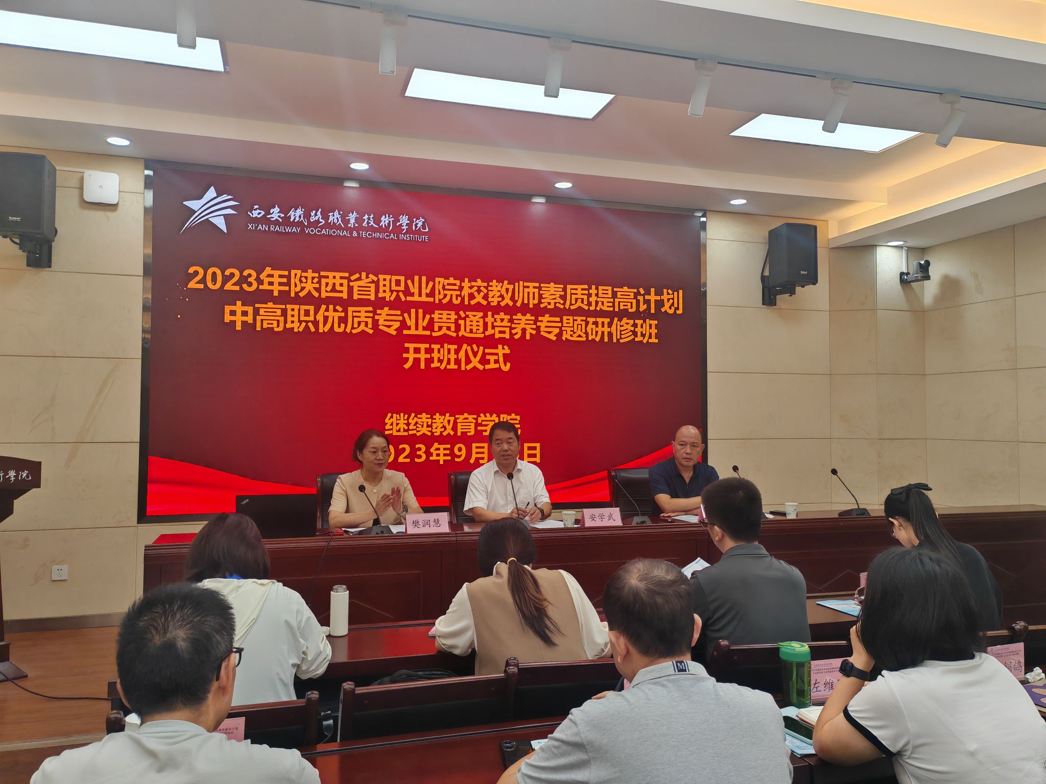2023年9月18日上午, 2023年度陕西省中高职优质专业贯通培养专题研修班在鸭脖自强校区顺利开班。学校继续教育学院院长樊润慧主持开班仪式,学院副院长安学武出席并致辞,学校发展规划处处长马军强介绍培训方案,来自全省的40余名中高职院校管理人员、专业带头人、骨干教师及培训班班主任参加了开班仪式。