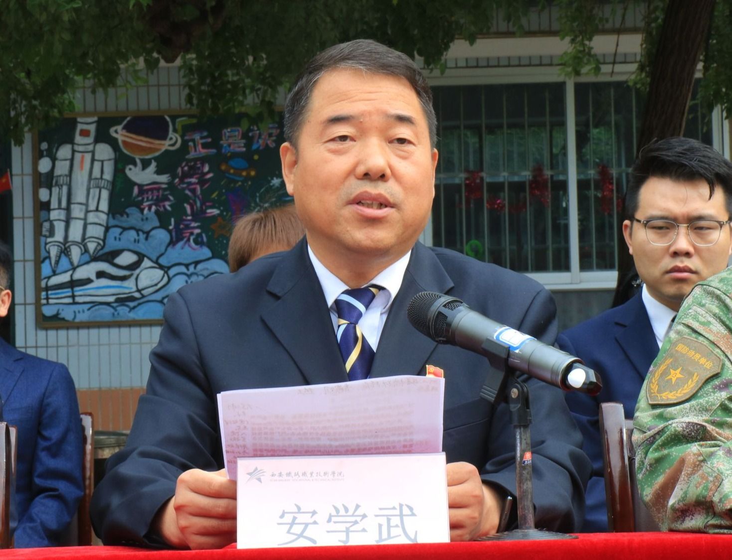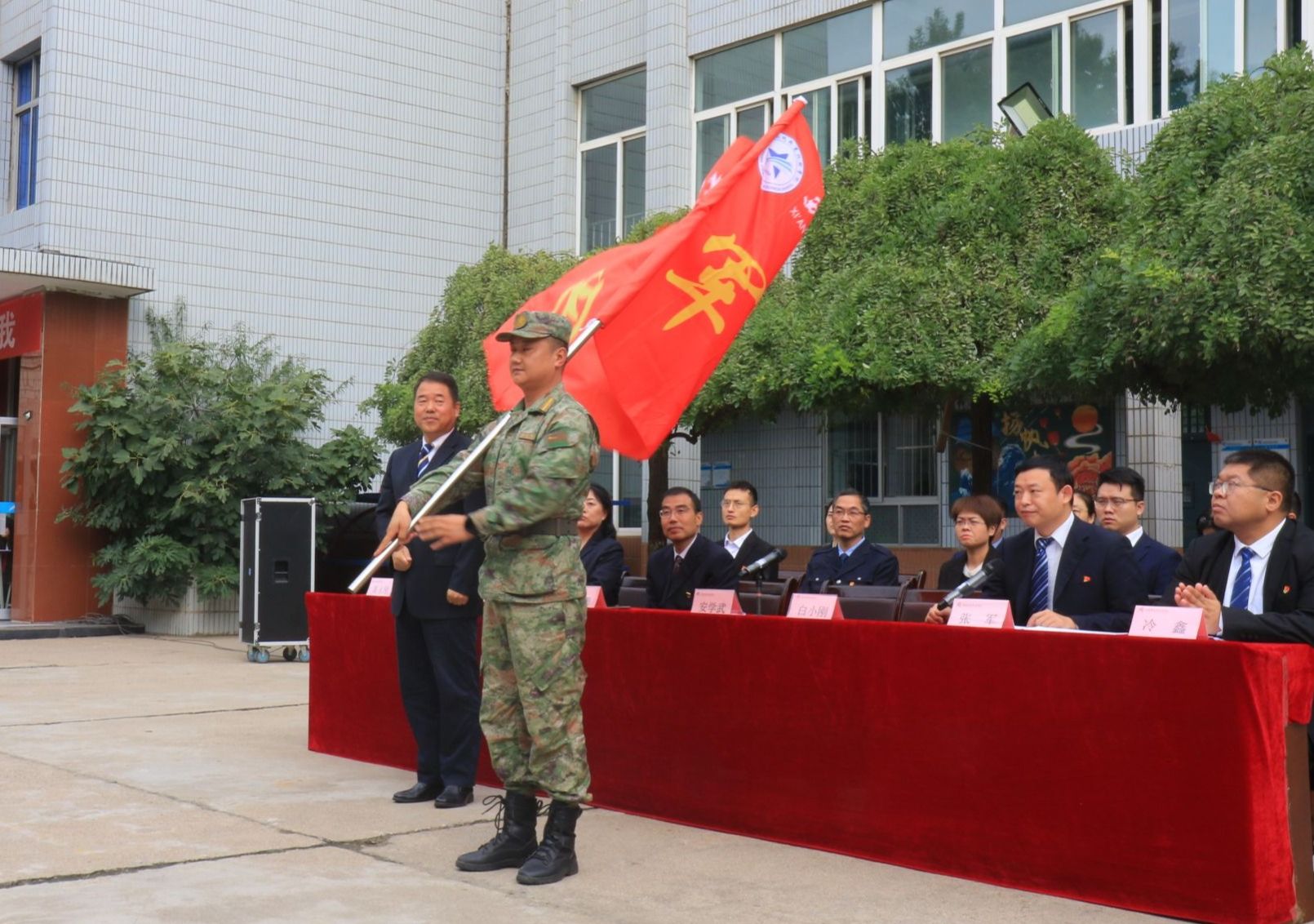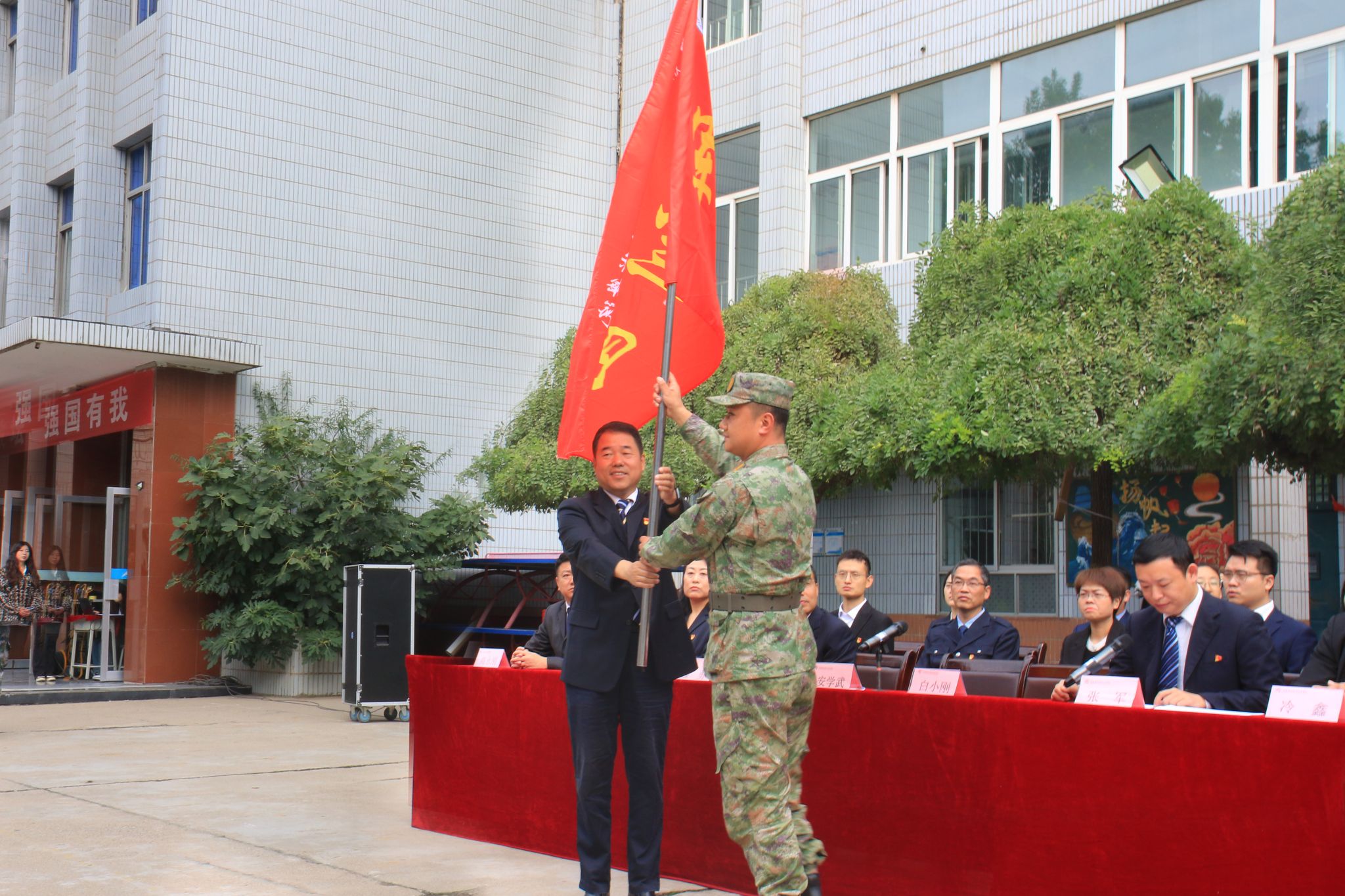 安学武向军训团授发了军旗,传递了沉甸甸的责任要求同学们的热情也更加高涨。这一庄重的仪式象征着军训活动的正式启动,也意味着同学们即将迎接挑战,勇攀高峰。