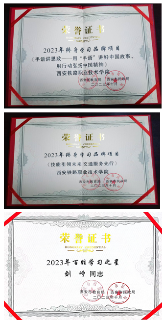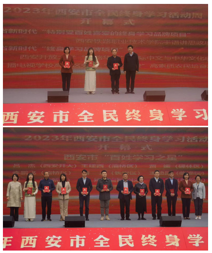 在活动现场,揭晓2023年西安市“百姓学习之星”“终身学习品牌项目”获奖名单并进行了颁奖。刘峥老师获得2023年西安市“百姓学习之星”荣誉;鸭脖的《手语讲思政——用“手语”讲好中国故事,用行动弘扬中国精神》《技能引领未来,交通服务先行》分别获得2023年西安市“终身学习品牌项目”荣誉。