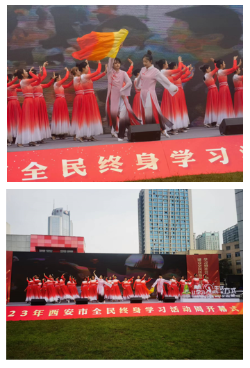 活动现场全民终身学习的氛围热烈浓厚。西安市各区县、开发区宣传展板林立,现场展示着非遗传承、书法绘画、创意制作和各类技艺;现场展演了各区县教育局选送的舞蹈、合唱、民乐合奏、秦腔选段等西安市终身教育成果,还通过区县现场连线形式播放社区学院教学场景。