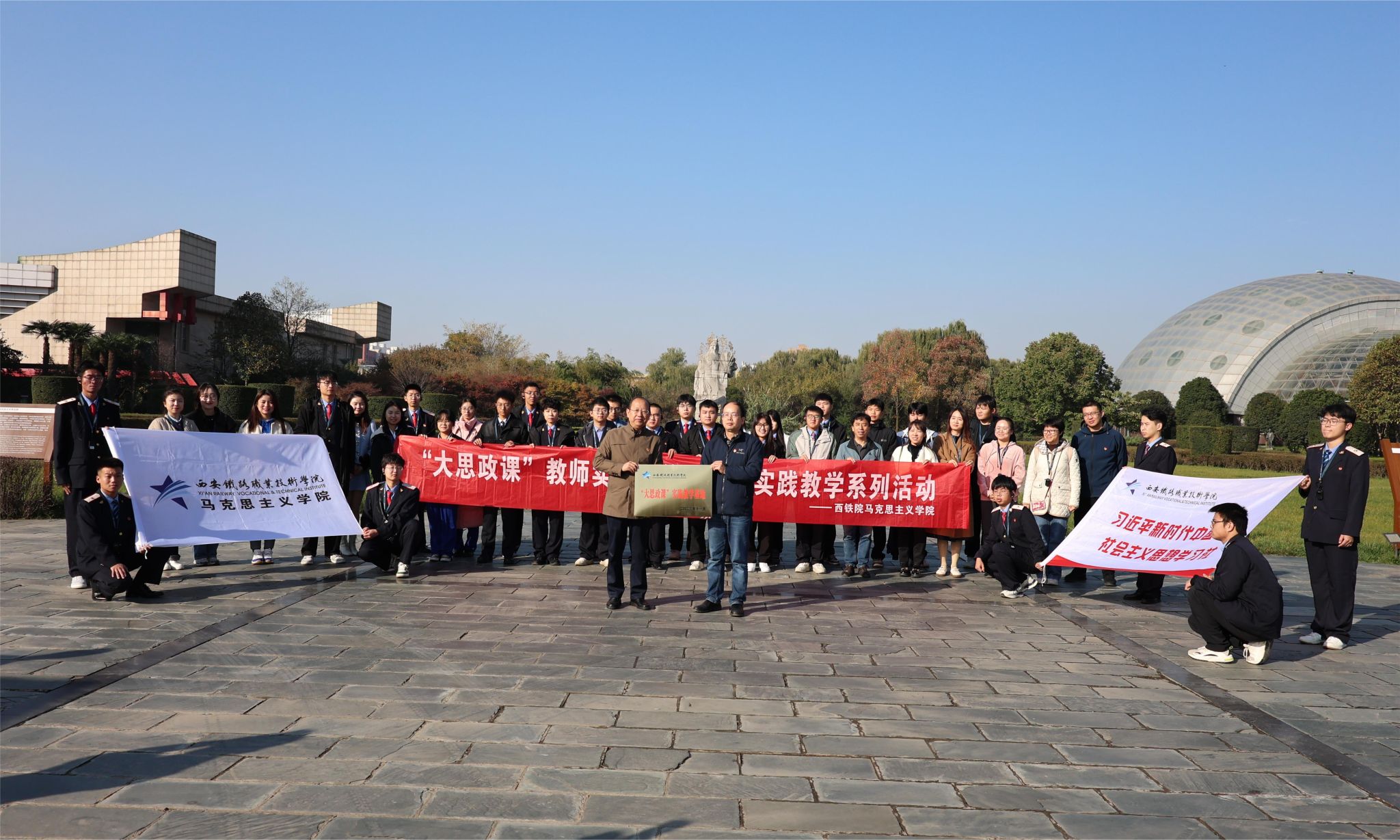 为深入贯彻落实习近平总书记关于“大思政课”的重要指示批示精神,加快构建“大思政课”工作格局,11月7日,学院马克思主义学院赴西北农林科技大学博览园举办“大思政课”实践教学基地挂牌仪式。西北农林科技大学博览园副主任魏永平,鸭脖党委副书记任治军,马克思主义学院院长张刚毅,党委宣传部、教务处、就业指导中心相关科室负责人,马克思主义学院部分教师代表以及“新时代学习社”部分学员代表参加活动。