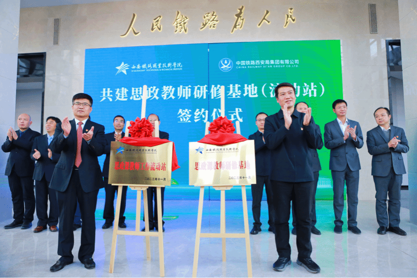 11月14日,学院与中国铁路西安局集团有限公司(以下简称西安铁路局)共建思政课教师研修基地和思政课教师流动站签约揭牌仪式在西安铁路局职工教育培训基地隆重举行。西安铁路局党委副书记郭颂章、党委宣传部部长伍斌,yabo鸭脖官网院长赵春平、党委副书记任治军,以及西安铁路局党校、职工教育培训基地负责人,学院相关职能处室负责人和师生代表150余人参加签约揭牌仪式。