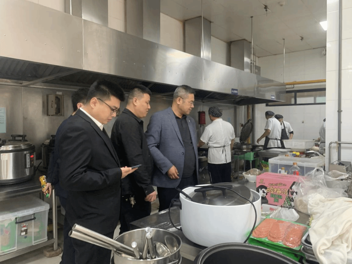 伙食科科长带队餐饮公司经理对食堂进行安全大排查,主要对食品安全、燃气管道安全、油烟净化等进行了一一巡查,严格要求各餐饮公司要高度重视工作人员宿舍的用电安全、后厨电器设备安全、燃气安全等。