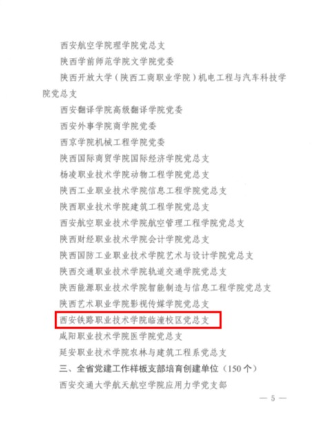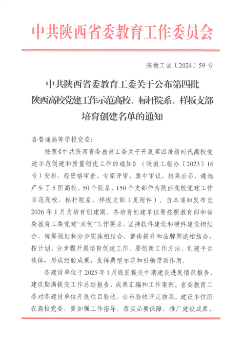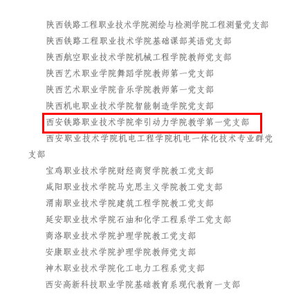 近日,陕西省委教育工委公布了全省第四批新时代高校党建示范创建和质量创优工作遴选结果,鸭脖临潼校区党总支成功入选第四批全省党建工作标杆院系培育创建单位,牵引动力学院党总支教学第一党支部入选全省党建工作样板支部培育创建单位。