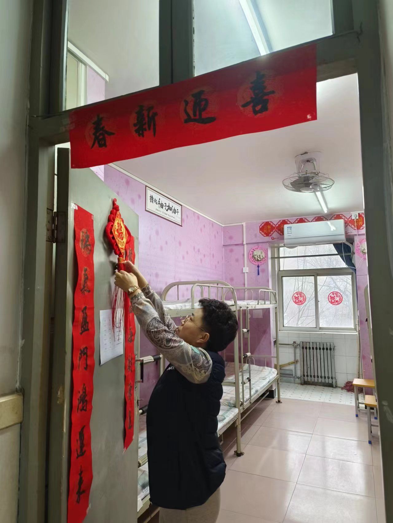 此前,工作专班学生管理组已按《方案》要求,对52名学生特别是其中15名外校学生的住宿进行了精心安排。宿舍贴上了春联,窗户贴上了窗花,让学子们在入住时,“小年小念,游子如归。”