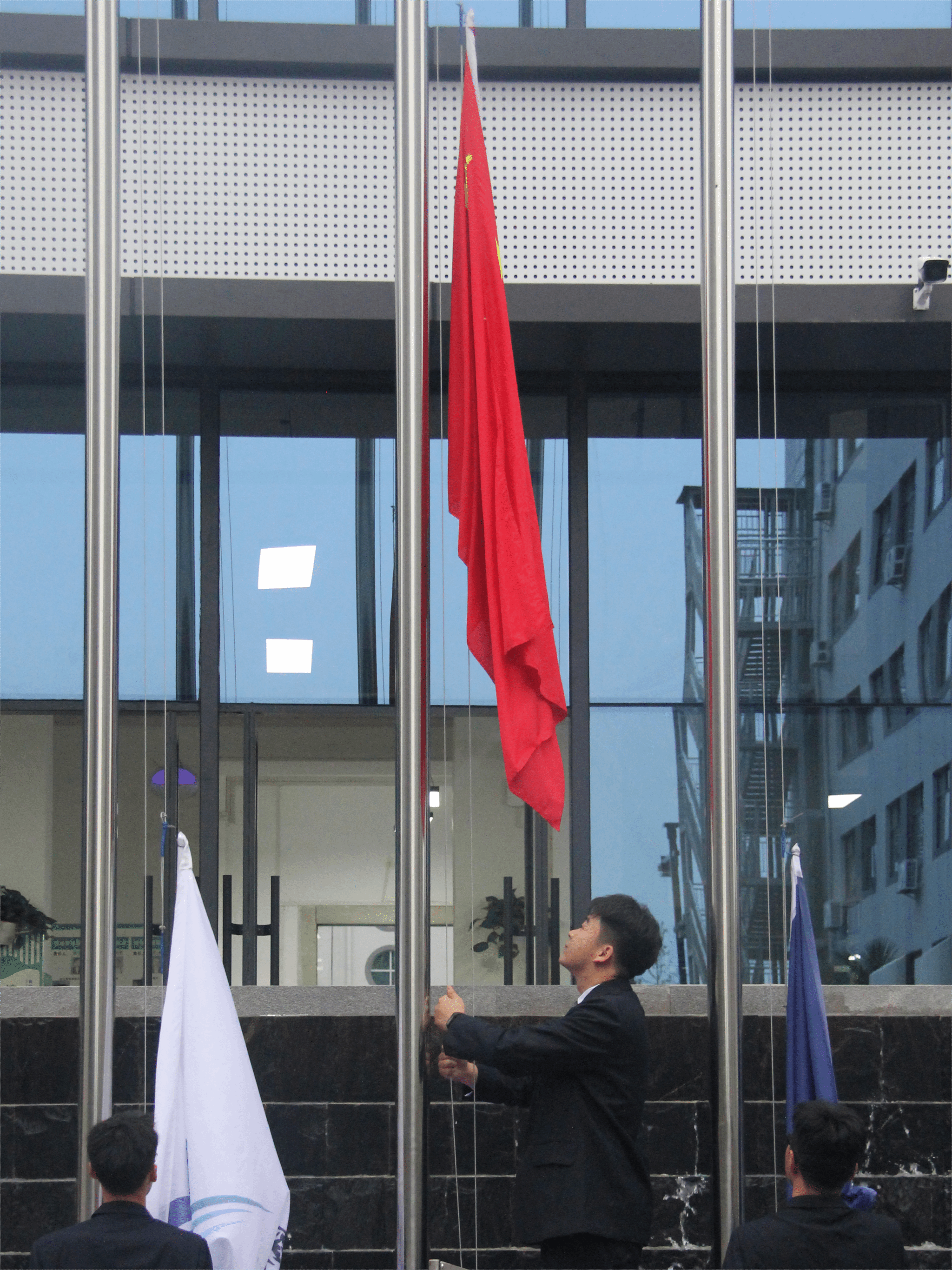 早晨7点,在全场师生的注目礼下,伴随着激昂雄壮的国歌声,鲜艳的五星红旗冉冉升起,全场师生肃立注目,齐齐高唱国歌,表达对伟大祖国的无限热爱和由衷敬意。