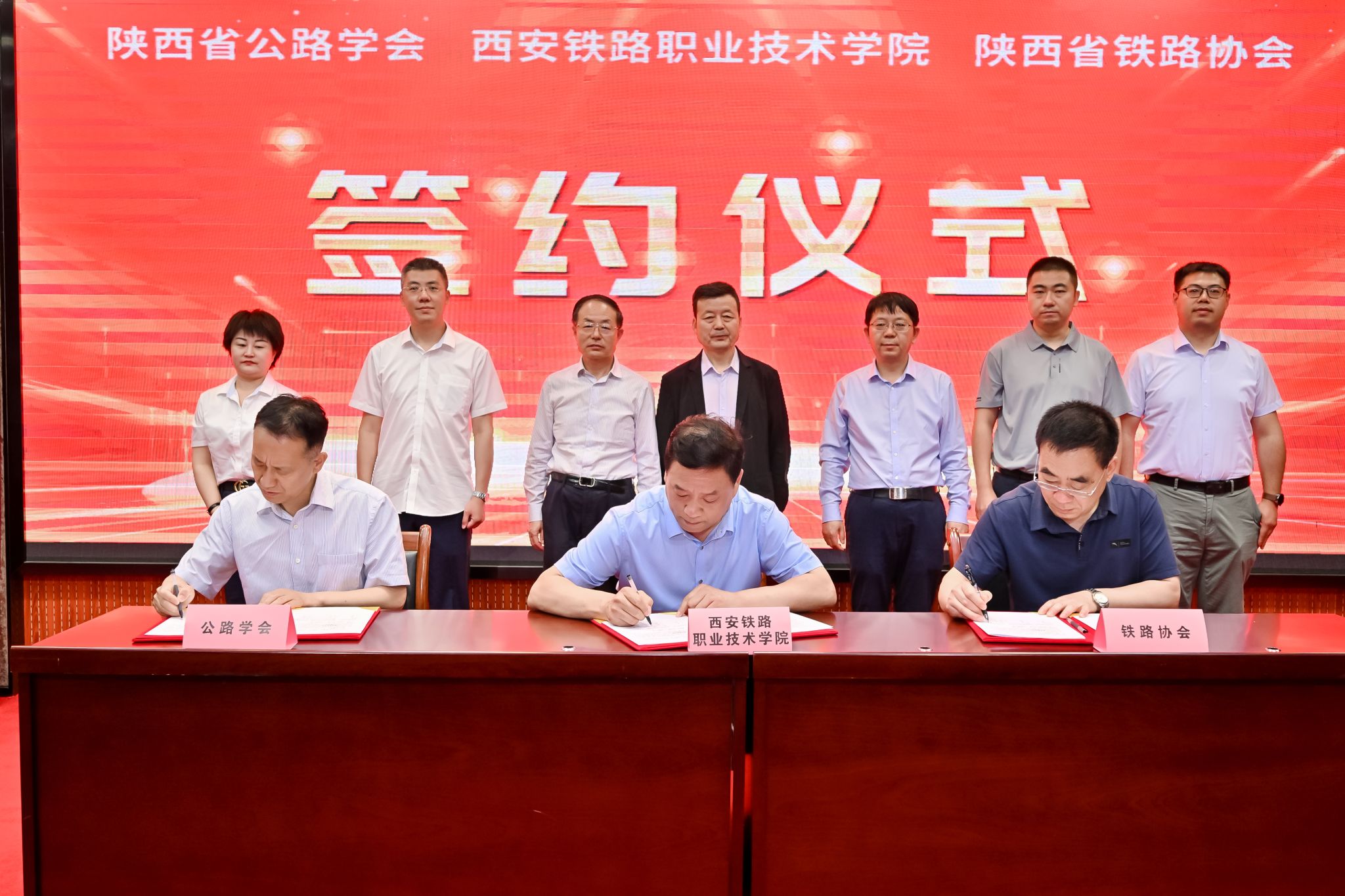 省公路学会、省铁路协会和鸭脖三方签署框架合作协议;杨育生理事长和省铁路协会苏小军会长给鸭脖颁授“交通运输科普教育服务站”牌匾。