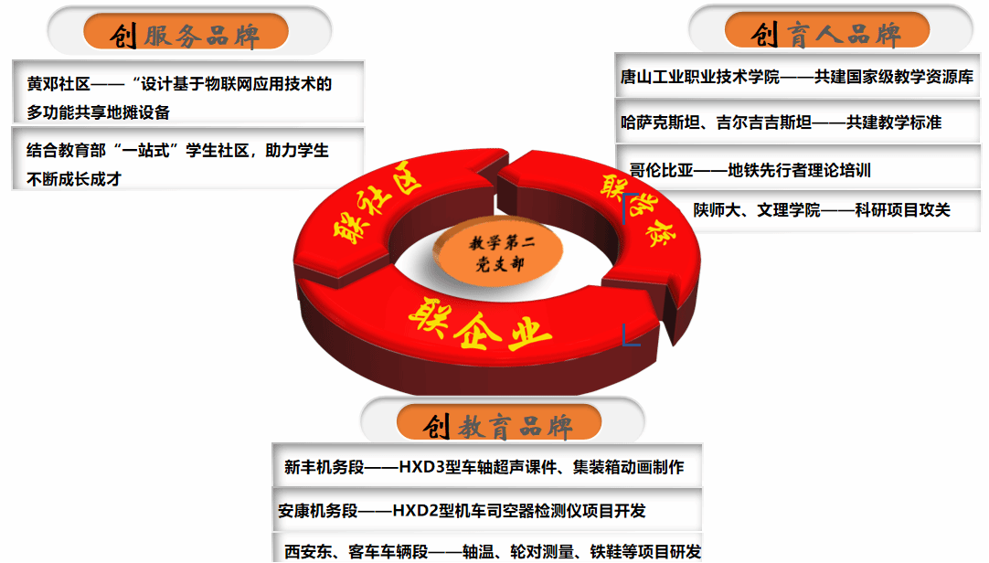机电工程学院党总支教学第二党支部坚持“三联三创”党建工作思路,将党建与业务紧密融合,联学校,创教育品牌;联企业,创育人品牌;联社区,创服务品牌。支部积极响应国家创新创业号召,将思想引领和价值观塑造有机融入教师教学科研、学生学习生活,引领带动师生投入创新创业工作,先后成立了国家级轨道交通职业教育与技术协同创新中心、yabo鸭脖官网众创空间、机电设备检修中心、铁道车辆专业群创新工作室。支部党员带领师生积极参与企业项目开发、参与创新创业大赛。2017-2023年,学生共成立了14家创新创业公司。在各类大赛中获得省级以上奖项59项。 其中,全国行业技能竞赛中获奖1 项,“挑战杯”和“互联网+”大赛中获得国家级奖项9项,省级奖项50项,获批国家专利14项。2023年团队作品《自适应高精度数字化便携式机车司控器线路检测仪》荣获第十八届“挑战杯”全国大学生课外学术科技作品竞赛(简称“大挑 ”)主体赛全国一等奖,该奖项是陕西省高职院校在“大挑”竞赛国家级荣誉方面取得的新突破。