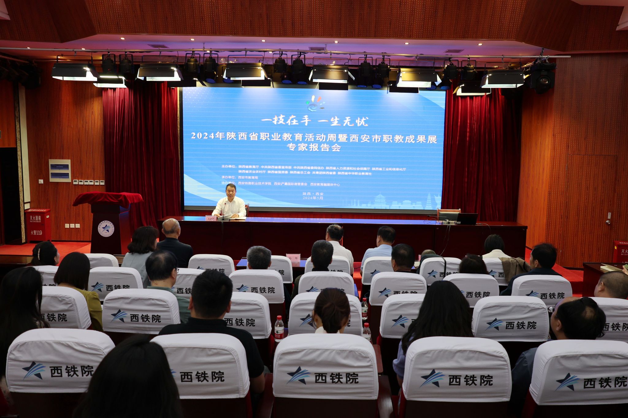 活动当日,2024年陕西省职业教育活动周暨西安市职业教育成果展在鸭脖同步举办,分为专家报告会和中职学校技能展示两个环节。西安市各区县教育局分管领导以及学院处科级干部、教师、教学管理人员等200余人参加。全国机械振动与冲击标准化技术委员会委员、中国振动工程学会会员、中国工程教育认证专家、西南交通大学青岛轨道交通研究院院长林建辉,北京劳动保障职业学院教务处、发展规划处处长孙辉分别作了《大力发展轨道交通新质生产力、加快培育专精特新技术技能人才》《以产教融合推动职业教育高质量发展》的专题报告。