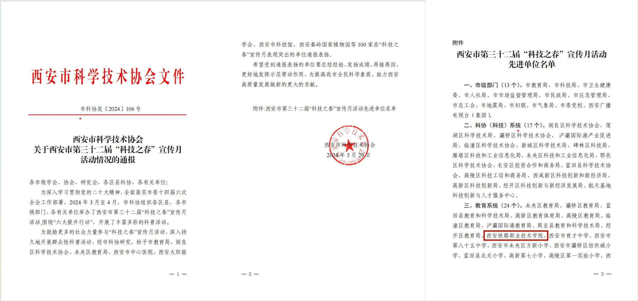 日前,西安市科学技术协会公布了西安市第三十二届“科技之春”宣传月评选结果(市科协发〔2024〕106号),鸭脖荣获“科技之春”宣传月先进单位。本次“科技之春”活动期间,学院紧紧围绕《全民科学素质行动计划纲要》精神,结合前几届“科技之春”活动的经验,精心组织、悉心筹划,就“科技之春”宣传月的主题、内容、时间、地点以及活动的组织、协调安排和工作要求进行了统筹部署,积极准备,认真策划,保证了“科技之春”活动月的顺利进行。