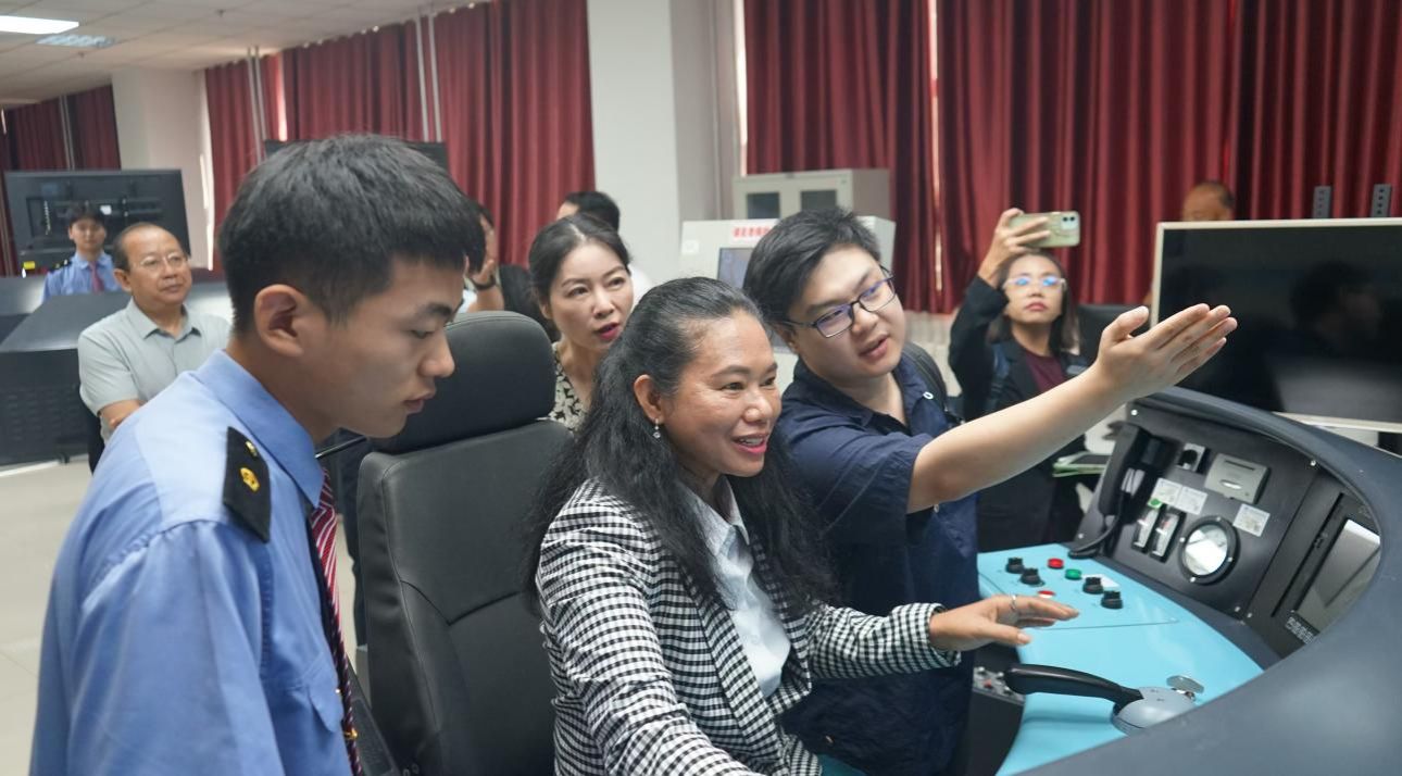 考察团先后参观了学院轨道交通综合实训中心、牵引动力综合演练场、动车组模拟驾驶实训室、磁悬浮列车实训室等实习实训场所。在牵引动力学院院长李益民的邀请下,蒙妮卡亲自体验了复兴号动车组模拟驾驶。