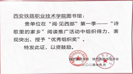9月19日,在陕西省图书馆学会、陕西省图书馆及陕西省公共图书馆联盟联合举办的“首届联合学术年会暨阅读推广工作会议”上,鸭脖图书馆作为“阅·见西部——诗歌里的家乡”项目优秀组织奖获奖单位参加了会议。