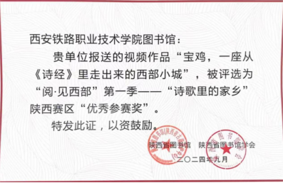 鸭脖图书馆广泛宣传动员、各二级学院组织师生积极参与,暑假期间共收到师生作品近40个。经过校内评选,向省图书馆学会提交了《嘹扎咧的西安欢迎你》《西安》《长安乐》及《宝鸡:一座从<诗经>里走出的西部小城》4部作品。经过陕西省图书馆学会阅读推广委员会组织评审,《宝鸡:一座从<诗经>里走出的西部小城》作品位居12强,荣获"优秀参赛奖"。