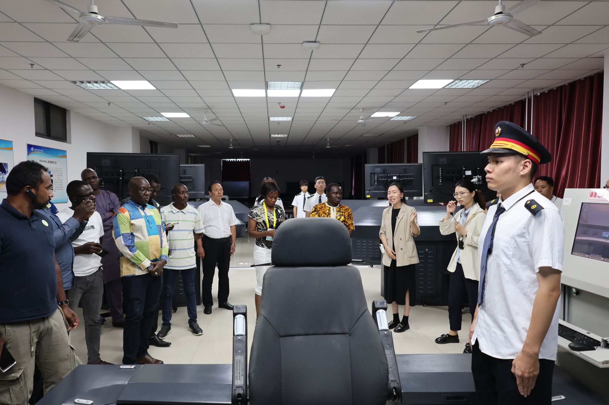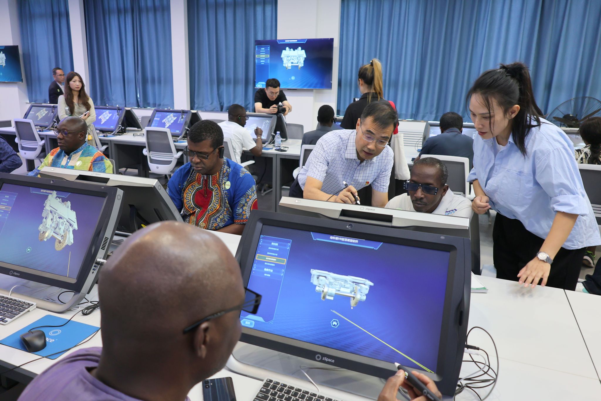 外宾们在牵引动力学院党总支书记李贞伟的陪同下参观了牵引动力学院实训中心。专业教师朱亚男介绍了国家级虚拟仿真实训基地,记者们在滕勇的邀请下亲自体验了仿真软件的操作。