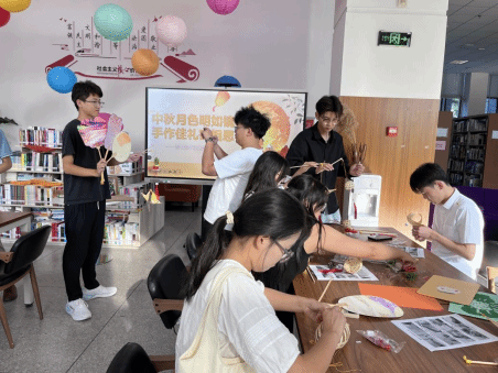 活动在一楼大厅举办,现场张灯结彩,处处洋溢着节日的喜庆。图书馆精心准备了版画拓印、漆扇制作与中秋小灯笼制作等多项传统手工艺体验项目。