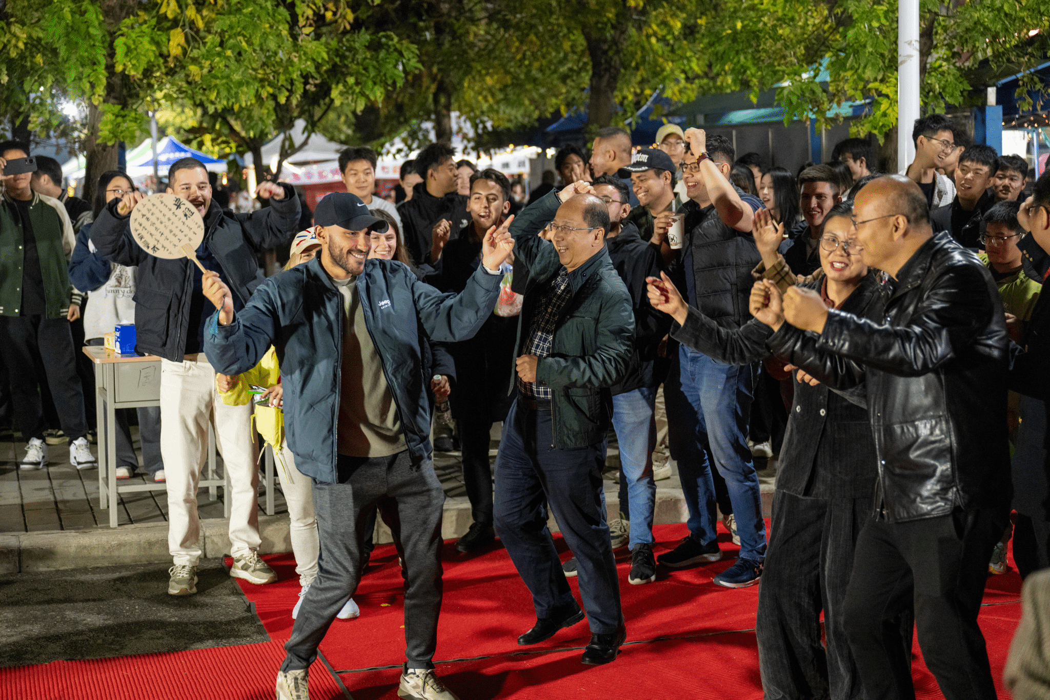 音乐响起,悠扬的旋律弥漫在整个集市上。师生们围成一圈,随着节奏轻轻摇摆,共同享受这一刻的欢乐,笑声在夜空中回荡,与夜晚的星光交相辉映。