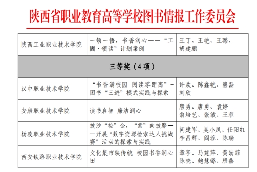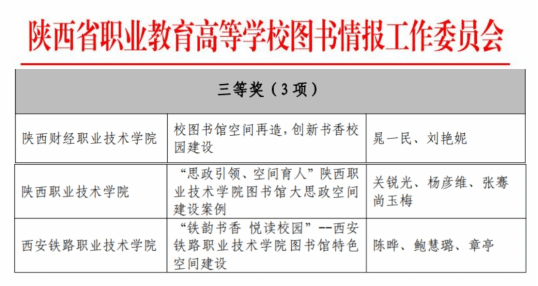 在陕西省高职高专院校图书馆特色空间建设案例征集活动中,鸭脖图书馆陈晔、鲍慧璐、章亭的《“铁韵书香 悦读校园”——yabo鸭脖官网图书馆特色空间建设》案例荣获三等奖。