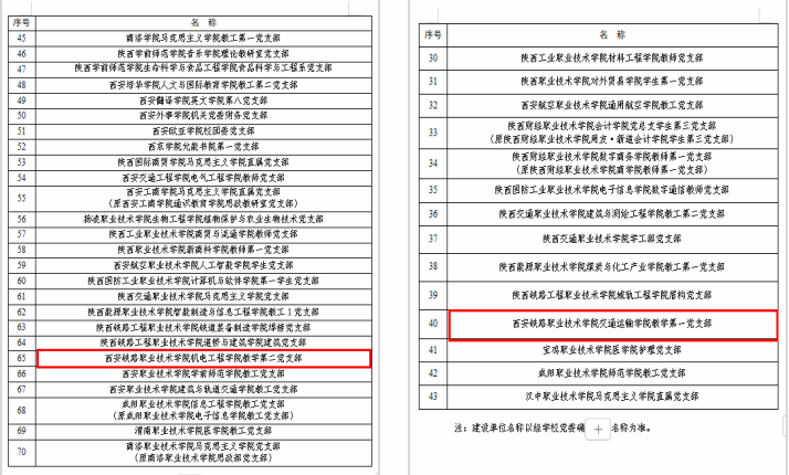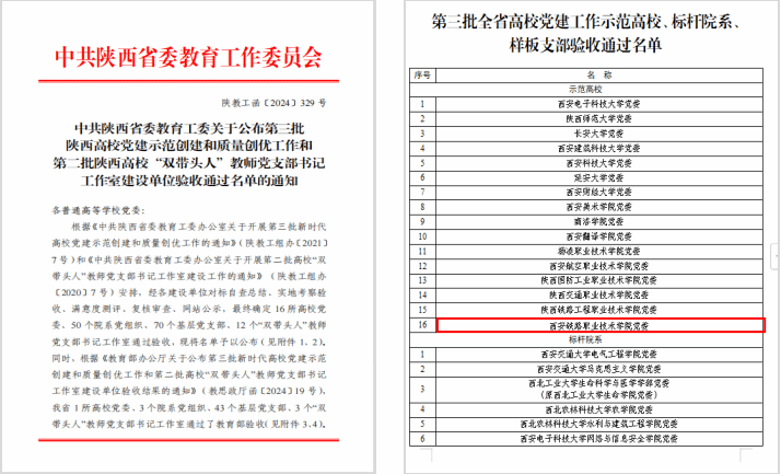 近日,省委教育工委公布了第三批陕西高校党建示范创建和质量创优工作验收结果,鸭脖党委顺利通过第三批全省高校党建工作示范高校培育创建验收,交通运输学院教学第一党支部顺利通过第三批全国高校党建工作“样板支部”培育创建验收,机电工程学院教学第二党支部顺利通过第三批全省高校党建工作“样板支部”培育创建验收。