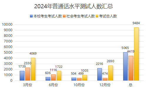 日前,鸭脖语测站圆满完成2024年国家级普通话水平测试工作。于年内3、6、10、12月份组织开展了四批次语言测试工作,累计循环测试490场次持续27天,社会人员和鸭脖学生9484人在龙首校区语测站顺利参加了普通话水平测试。