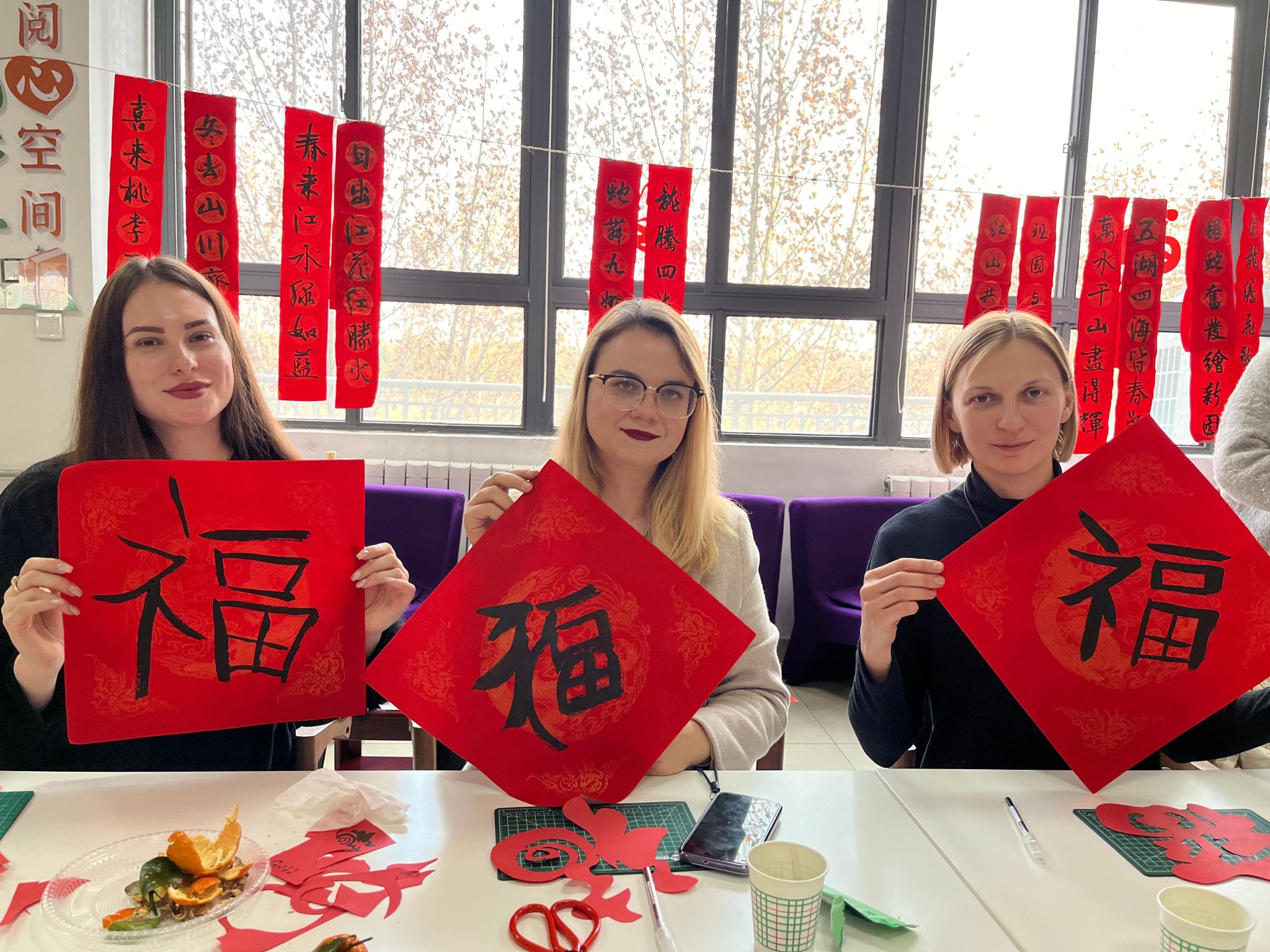 活动中,滕勇、毛卫军、王树、马建萍、周文博、王唯燕、张光华等老师以及书法名师李铭、国际交通学院外籍教师及学生书画社代表现场挥毫泼墨,或笔走龙蛇、气势磅礴,或细腻温婉、韵味悠长,在热闹祥和的氛围中,一幅幅寓意吉祥、带着美好祝福的春联呈现在大家面前,现场为师生们送出了近200副春联和“福”字。