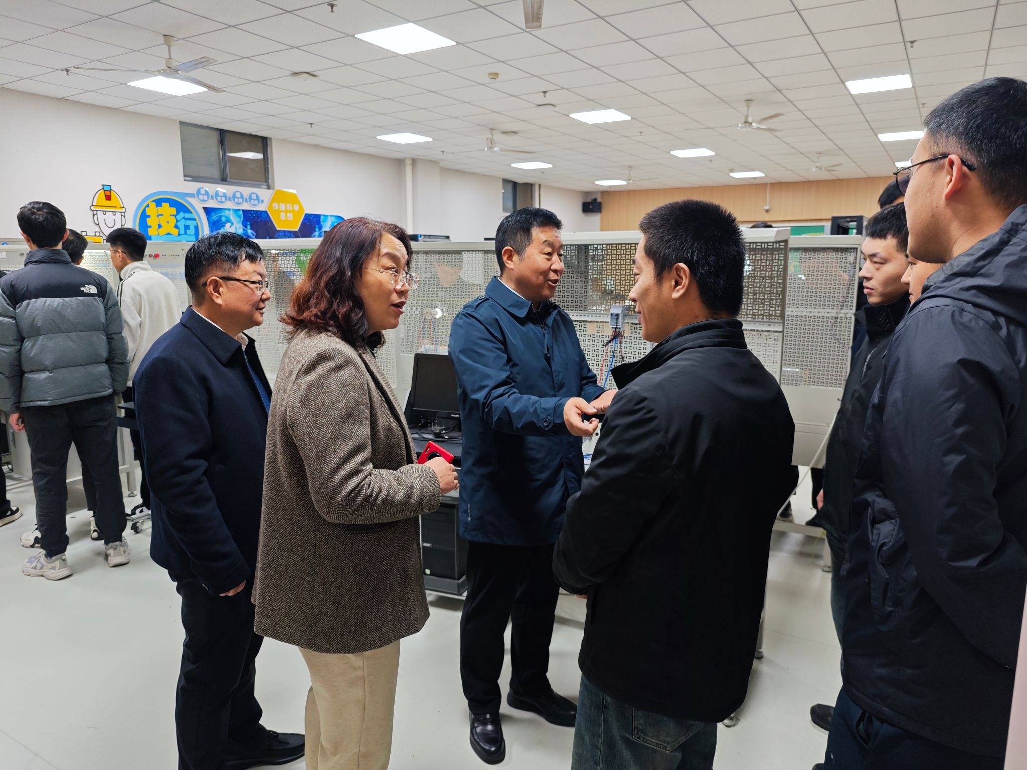调研组一行实地参观了我校的校史馆,深入了解办学历史与特色优势;走进退役军人电工班课堂,与参训学员面对面交流,询问学习进展与生活保障情况。一行人重点考察了电气工程学院可编程控制实训室、电工实验室等教学场景,对鸭脖依托高水平实训设施开展“理论+实操+案例”一体化教学模式表示高度认可。