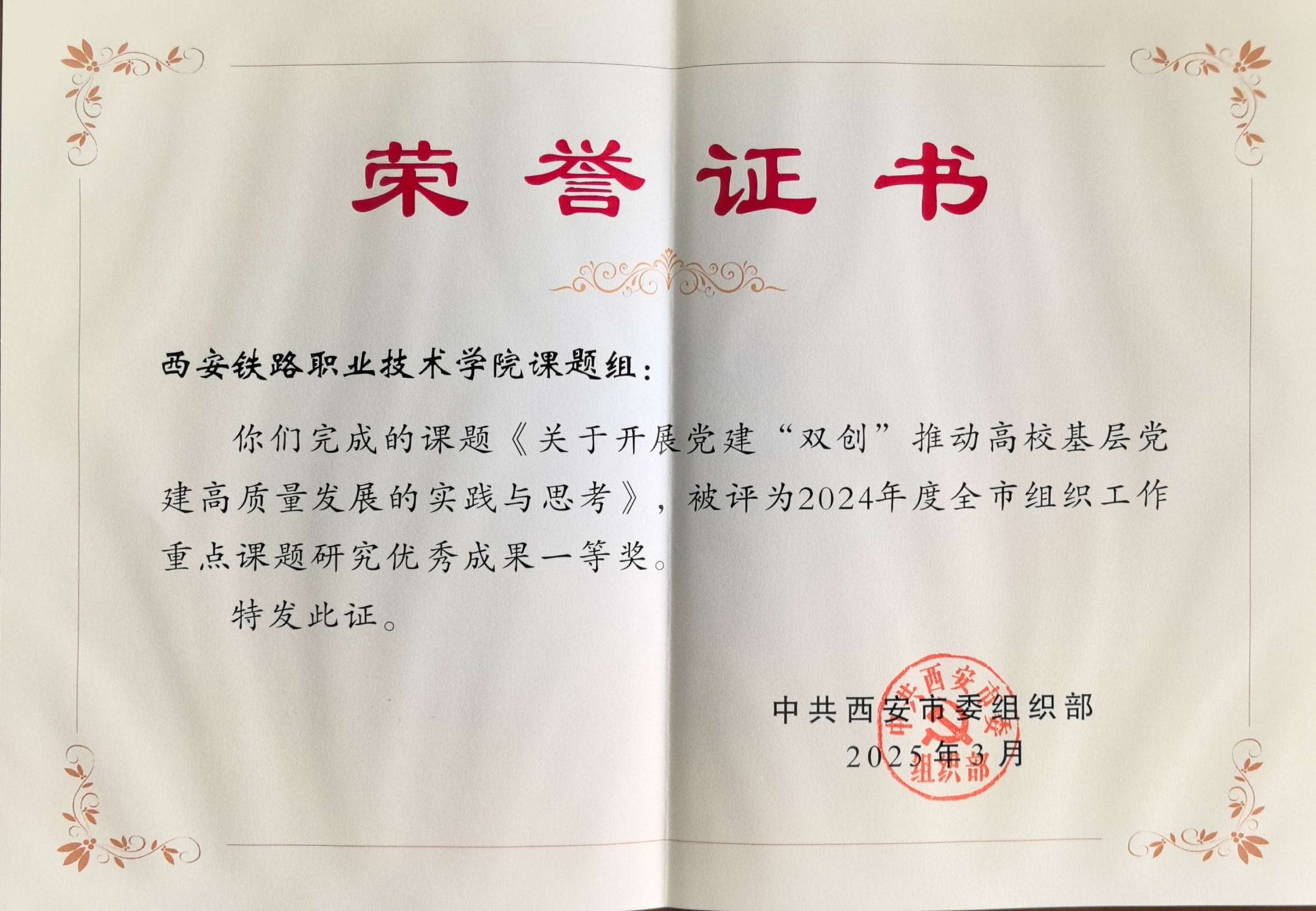 近日,西安市委组织部发布了《关于表彰2024年度全市组织工作重点课题研究优秀成果的通报》(市组通字〔2025〕12号)和《关于表彰2024年度全市组织工作改革创新项目优秀成果的通报》(市组通字〔2025〕11号),鸭脖申报的《关于开展党建“双创”推动高校基层党建高质量发展的实践与思考》课题获得“2024年度全市组织工作重点课题研究成果”一等奖。《yabo鸭脖官网构建“红色动车”党建体系培养新时代“铁路人”》项目获得“2024年度全市组织工作创新项目”二等奖。