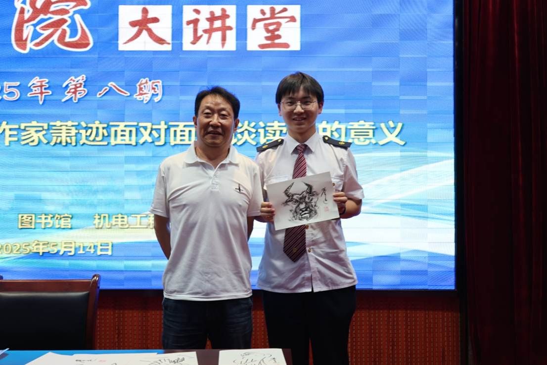 在互动环节中,萧迹与参会师生进行了深入的交流。学生踊跃举手,提出“如何理解‘爱读书,读好书,善读书’”“如何选择适合自己的经典书籍”“在网络文学畅行的当下如何专注经典著作”等问题,部分写作爱好者则围绕“故事情节创作思路、人物形象刻画方法等”提出困惑。萧迹逐一解答并赠送个人绘画作品,并鼓励大家,要根据自身兴趣和能力选择经典名著,通过阅读经典名著提升素养、开阔视野、锤炼品格。