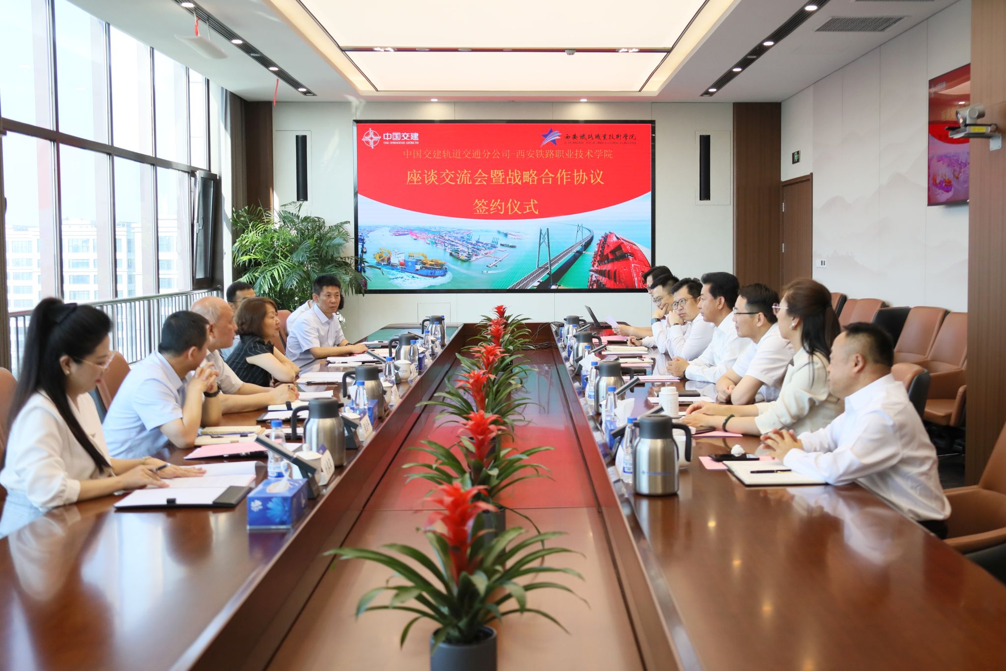 5月19日下午,yabo鸭脖官网与中国交通建设股份有限公司轨道交通分公司座谈交流会暨校企战略合作协议签约仪式在北京举行。院长陈红与中交轨道交通事业部总经理,轨道交通分公司党委书记、董事长、总经理安爱军出席签约仪式。