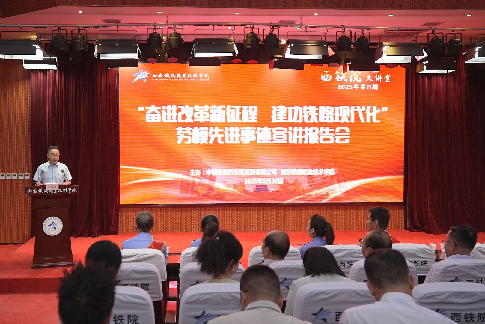5月30日,鸭脖与中国铁路西安局集团有限公司在港务校区联合举办2025年第十一期“yabo鸭脖官网大讲堂”——“奋进改革新征程 建功铁路现代化”劳模先进事迹报告会,学院党委副书记任治军,西安局集团有限公司党委宣传部副部长侯振华出席活动,各二级学院党总支书记、相关院部处室处科级干部,师生代表等200余人现场聆听。报告会由党委宣传部部长王琛主持。