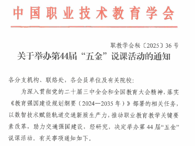 根据中国职业技术教育学会《关于举办第44届“五金”说课活动的通知》(职教学会秘[2025]36号),将于6月21日在南京铁道职业技术学院举办第44届“五金”说课活动,学院王军龙、冯国良、冯岩、高鸽子四位教师的优秀案例从全国众多竞争者中脱颖而出,成功入选现场展示环节。在本次说课活动是一次国家级的高规格、强竞争的平台展示,现场展示案例总计35个,入围学院18所,鸭脖独占4席,为省内轨道交通类高职第一,全国前列,占比超过11%。