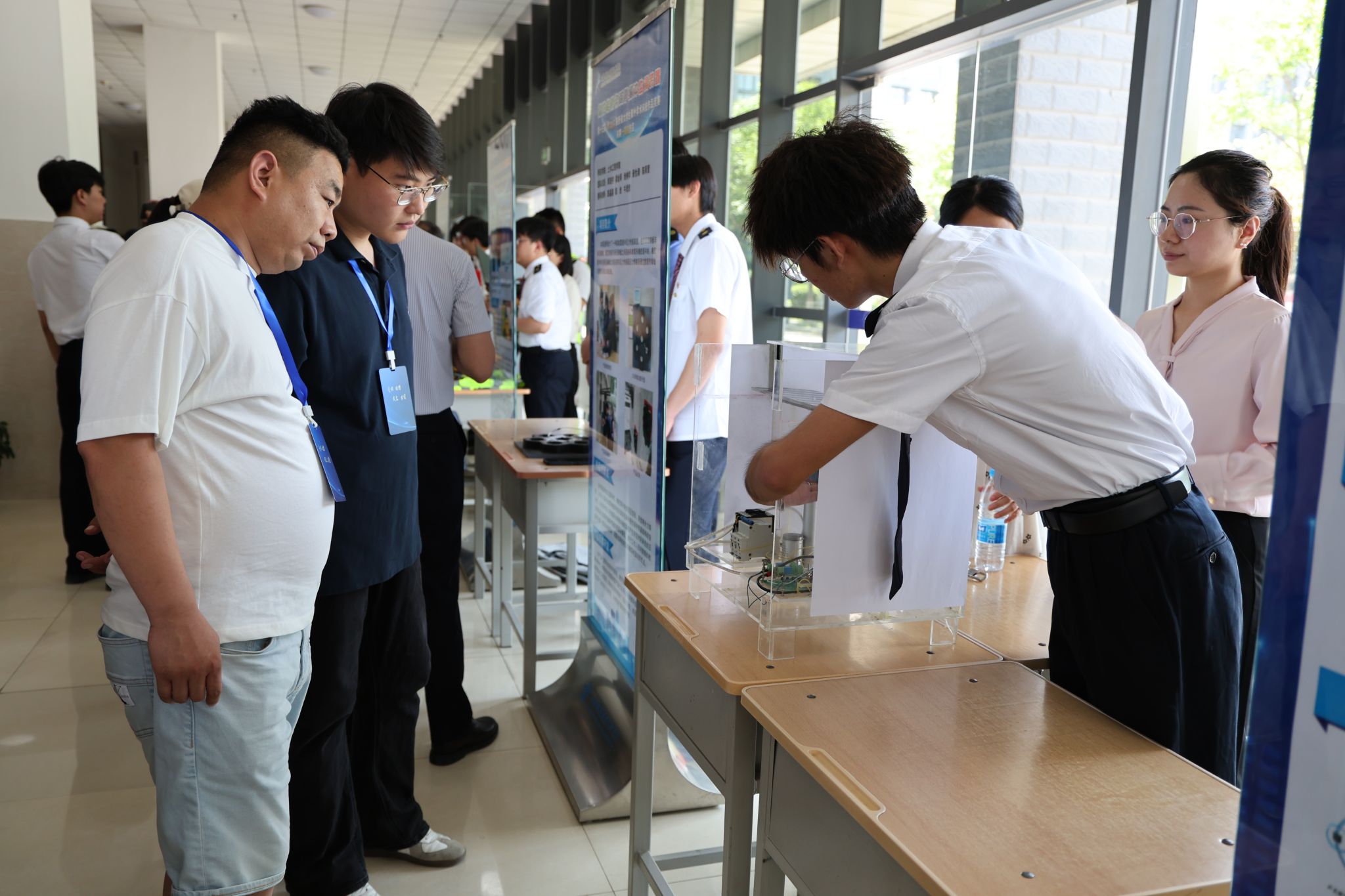 在办公楼一楼大厅,学员们现场观摩了学院大学生“挑战杯”省赛获奖优秀科技创新作品,切实感受到学院大学生身上散发出的创新活力与所取得的丰硕实践成果。