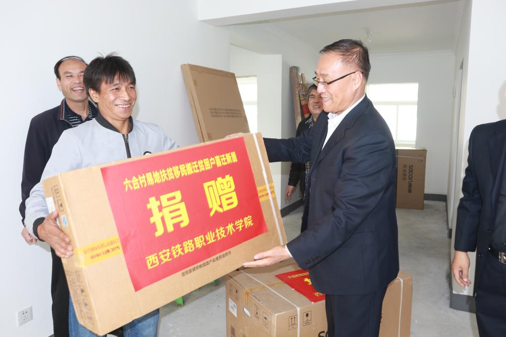 在辛口新型农村社区,邓耀斌来到村民胡小军家中,详细了解胡小军和金安虎两家的搬迁入住准备情况,并代表学院给他们送去了燃气灶和油烟机,向他们乔迁新居表示祝贺。