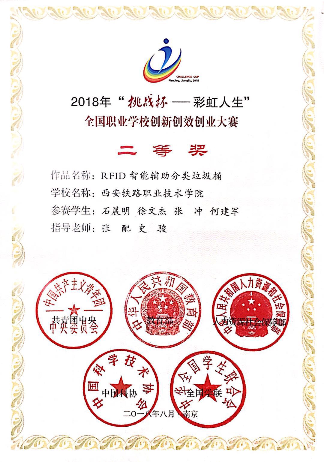 8月14至17日,由共青团中央、教育部、人力资源和社会保障部、中国科协、全国学联、江苏省人民政府共同主办的2018年“挑战杯——彩虹人生”全国职业学校创新创效创业大赛决赛在南京举行。鸭脖机电工程学院史骏、张配老师指导的学生作品《RFID智能辅助分类垃圾桶》,经过专家复赛和决赛的严格评审,最终荣获全国“二等奖”的优异成绩。