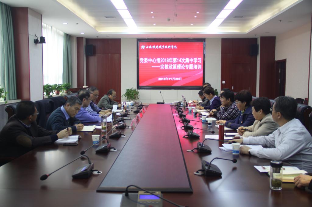 11月29日,学院党委理论学习中心组召开集体学习会议,专题学习《宗教事务条例》和习近平总书记在全国宗教工作会议上的重要讲话精神。学院领导班子成员参加学习,院长田和平主持。党委办公室、组织部、统战部、学工部、人事处、思政部及各二级学院负责人列席会议。